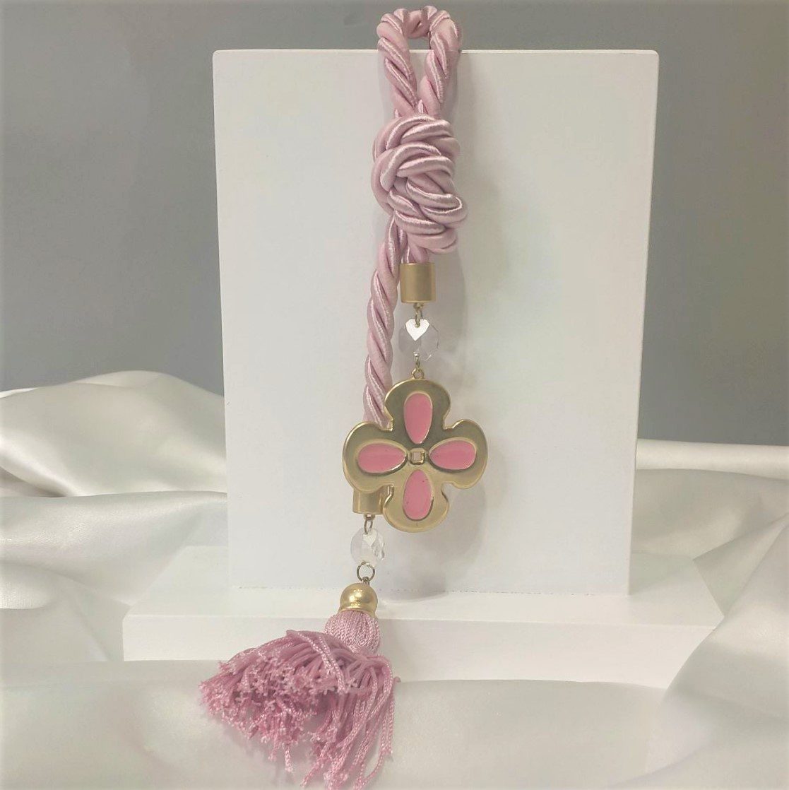 Δώρο γέννησης/βάπτισης τυχερό τριφύλλι επιχρυσωμένο με 24 καράτια , ροζ σμάλτο και ημιπολύτιμους λίθους, με μεταξωτή φούντα και σατέν κορδόνι σε ροζ. Ξεχωριστό δώρο για νεογέννητα ή νεοφώτιστα παιδιά! Συνολικό μήκος 33 εκ. Οι χειροποίητες δημιουργίες του Tresento είναι επιχρυσωμένες με 24 καράτια και διακοσμημένα με ημιπολύτιμους λίθους και σμάλτο. Ενδέχεται να χρειαστούν έως 15 εργάσιμες μέρες για την κατασκευή τους. Ελληνικής κατασκευής.