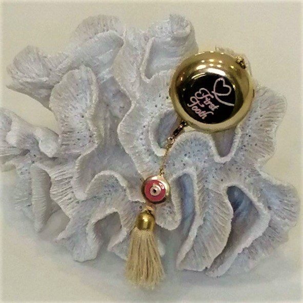 Δώρο για νεογέννητο θήκη δοντιών, επιχρυσωμένο με 24 καράτια, διακοσμημένο με χρυσή αλυσίδα, ματάκι με σμάλτο και μπεζ μεταξωτή φούντα. Ξεχωριστό δώρο για νεογέννητα ή νεοφώτιστα παιδιά! Συνολικό μήκος 18εκ. θήκη 6εκ. Οι χειροποίητες δημιουργίες του Tresento είναι επιχρυσωμένες με 24 καράτια και διακοσμημένα με ημιπολύτιμους λίθους και σμάλτο. Ενδέχεται να χρειαστούν έως 15 εργάσιμες μέρες για την κατασκευή τους. Ελληνικής κατασκευής.
