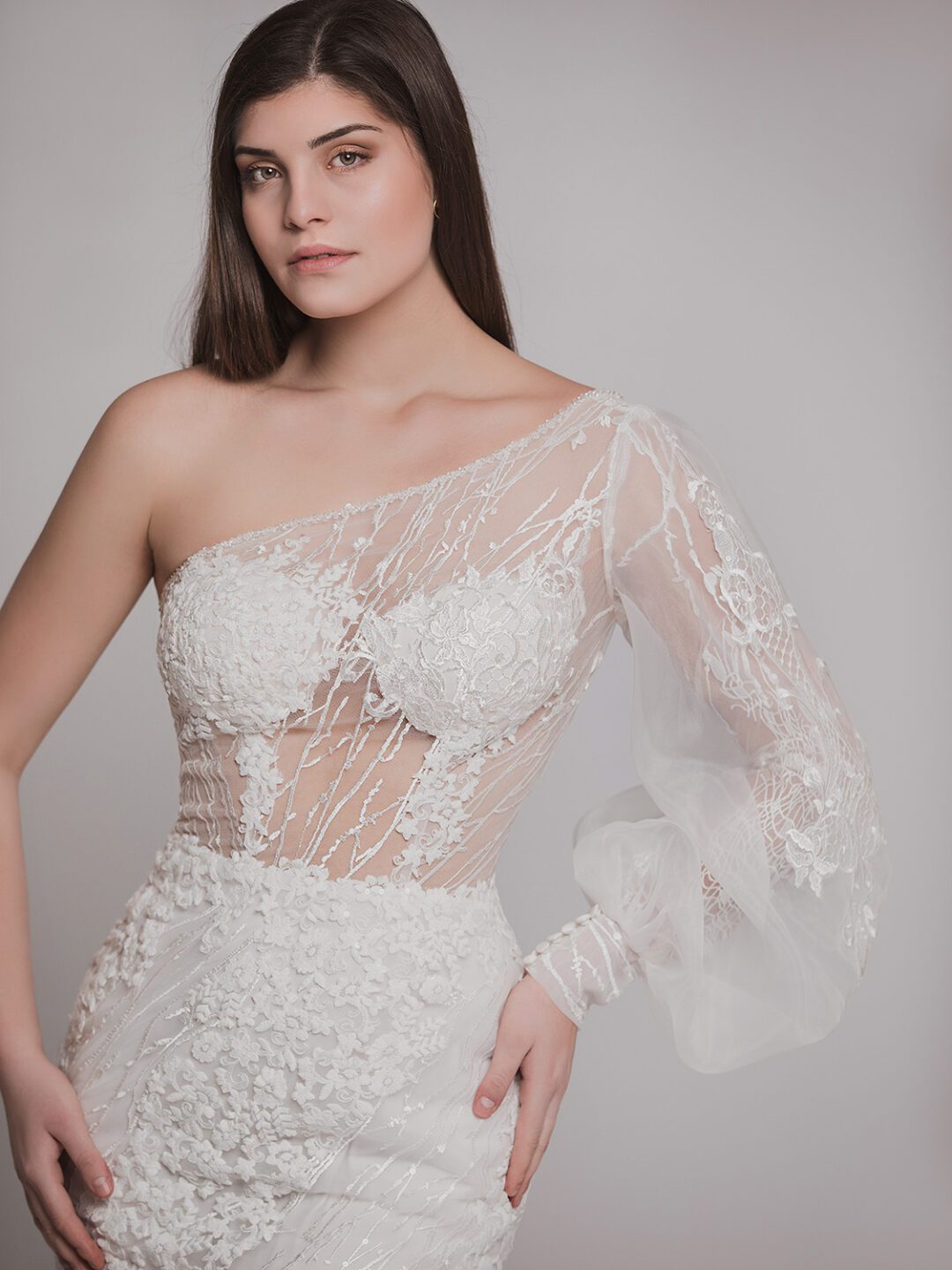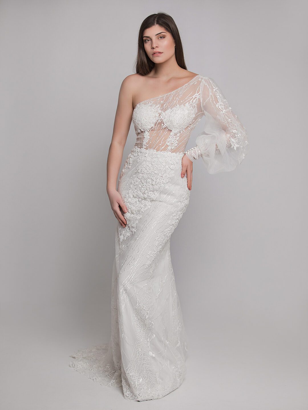 Εντυπωσιακό αρχαιοελληνικό νυφικό με ένα μανίκι σε στενή γραμμή σε χρώμα off white από γαλλικό τούλι με διαφάνειες στο μπούστο. Κεντημένο από γαλλική 3D δαντέλα, μανίκι από γαλλικό τούλι με εντυπωσιακά ραμμένα κεντήματα επάνω και κλείσιμο με κουμπιά. Φούστα σε στενή γραμμή που αναδεικνύει την θηλυκότητα της γυναίκας από γαλλικό τούλι κεντημένη με χειροποίητη γαλλική 3D δαντέλα και κλείσιμο στο πίσω μέρος του νυφικού με σατέν κουμπάκια!