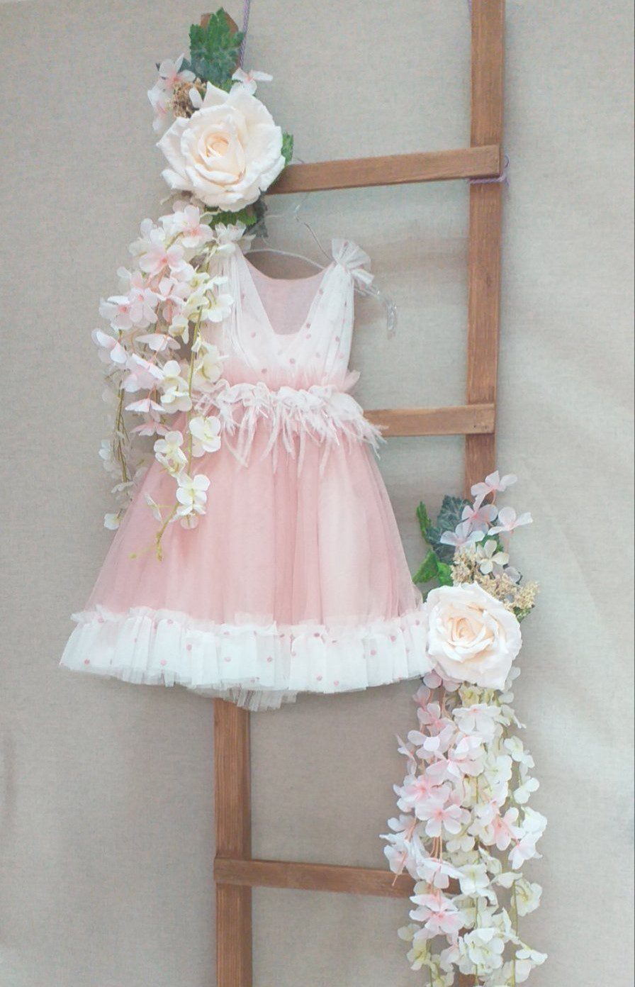 Εντυπωσιακό βαπτιστικό φόρεμα ροζ με λευκό πουά.Έχει σχέδιο με φτερά στην μέση.Καλύπτει εως 24 μηνών.