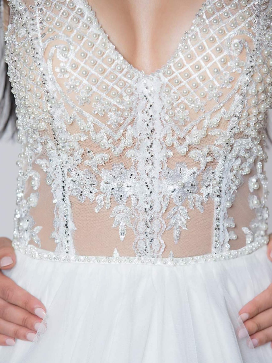 Εντυπωσιακό νυφικό με ολοκέντητο μπούστο με πέρλες και swarovski, με διαφάνεια soleil και ανοιχτή πλάτη. Φούστα από μεταξωτό τούλι.