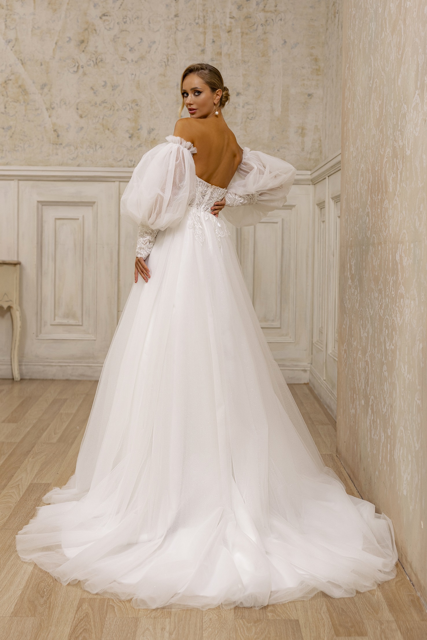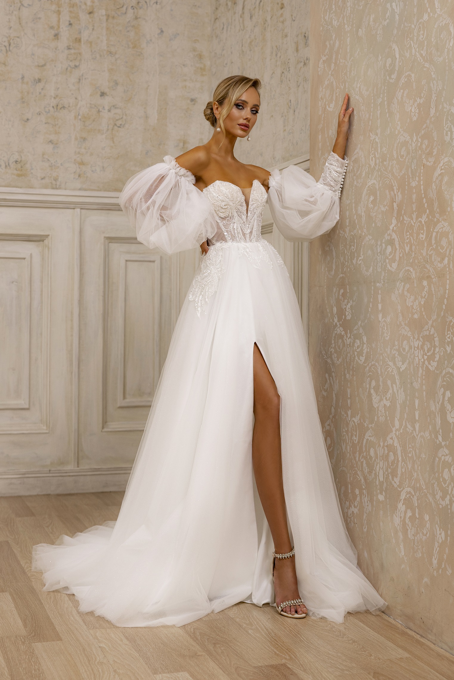 Εντυπωσιακό νυφικό με balloon μανίκια. Είναι στράπλες και διαθέτει σκίσιμο στο μπροστινό μέρος της φούστας.