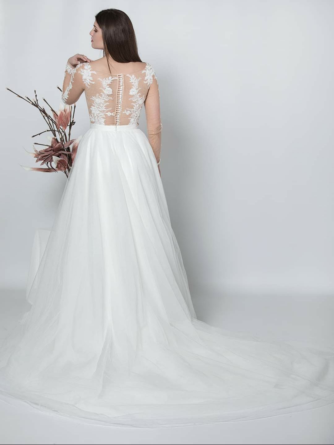 Εντυπωσιακό νυφικό σε Άλφα γραμμή, με φούστα από μεταξωτό τούλι. Εντυπωσιακό μπούστο με διαφάνεια soleil και απλικαρισμένη γαλλική δαντέλα. Μακρύ μανίκι με διαφάνεια και δαντέλα σε tatoo effect. Ελληνικής ραφής.