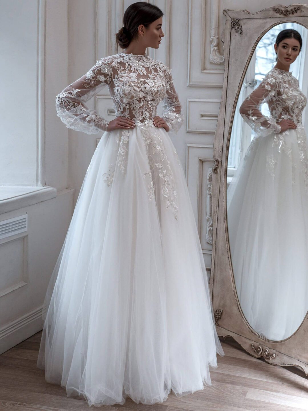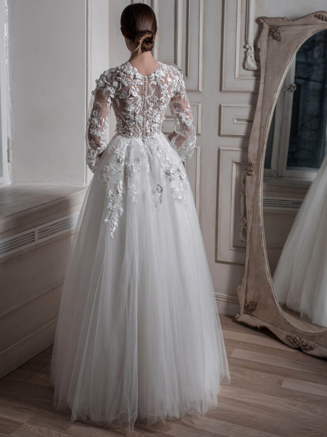 Επιβλητικό νυφικό, από γαλλική απλικαρισμένη ανάγλυφη δαντέλα πάνω σε γαλλικό τούλι σε όλο το πάνω μέρος και στα μανίκια. Πολλές νύφες μας, μας έχουν εμπιστευτεί και έχουν αγοράσει με τις συμβουλές μας το νυφικό τους online. Αν δεν είσαι σίγουρη για την εφαρμογή του μπορείς να κλείσεις ραντεβού για πρόβα στο info@missvanity.gr για να επισκεφτείς το φυσικό μας κατάστημα και κέρδισε 10% έκπτωση. Για οποιαδήποτε πληροφορία ή ραντεβού κάλεστε στο 22210 86623.