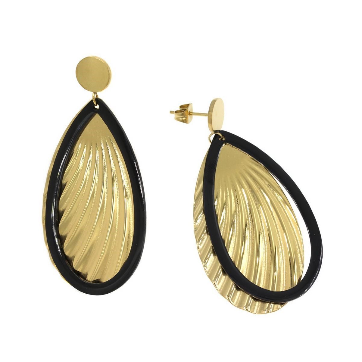 Επιχρυσωμένα κρεμαστά σκουλαρίκια από ατσάλι, σε σχήμα διπλό δάκρυ, με συνδυασμό χρυσό και μαύρο 55mm