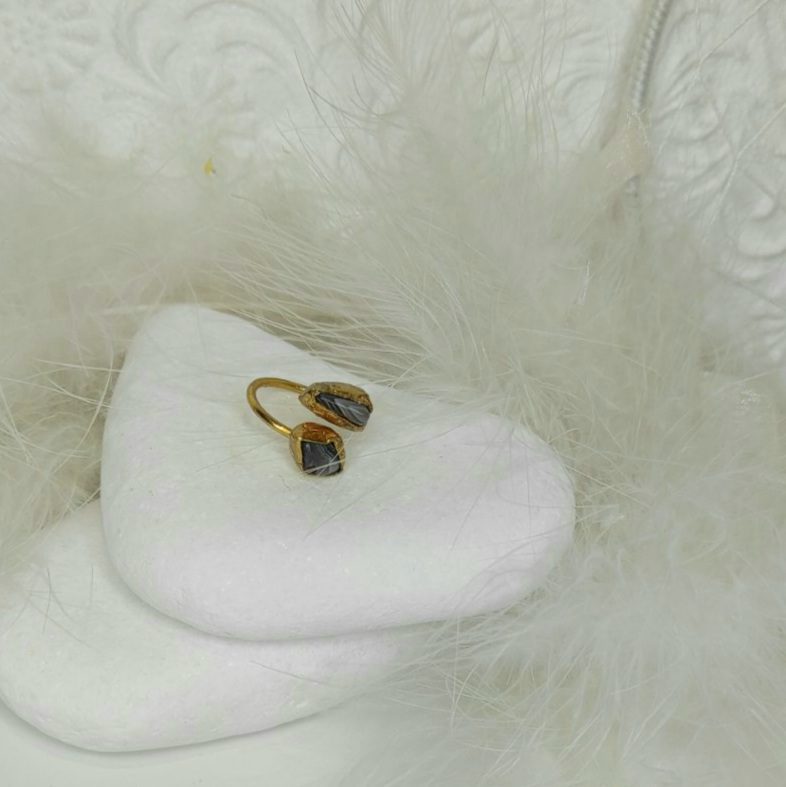Μοναδικό Επιχρυσωμένο Δαχτυλίδι διακοσμημένο με 2 διαφορετικές πέτρες από φυσικά ορυκτά, χωρίς νικέλιο (υποαλλεργικό) και λουστραρισμένο προστατεύοντας το κόσμημα από την οξείδωση. Προσαρμοζόμενο Μέγεθος 7-21cm.
