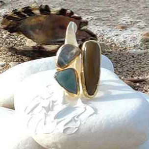 Μοναδικό Επιχρυσωμένο Δαχτυλίδι διακοσμημένο με 3 διαφορετικές πέτρες από φυσικά ορυκτά. H επιχρύσωση γίνεται χωρίς νικέλιο (υποαλλεργικό) και είναι λουστραρισμένο προστατεύοντας το κόσμημα από την οξείδωση. Προσαρμοζόμενο Μέγεθος 7-21cm.