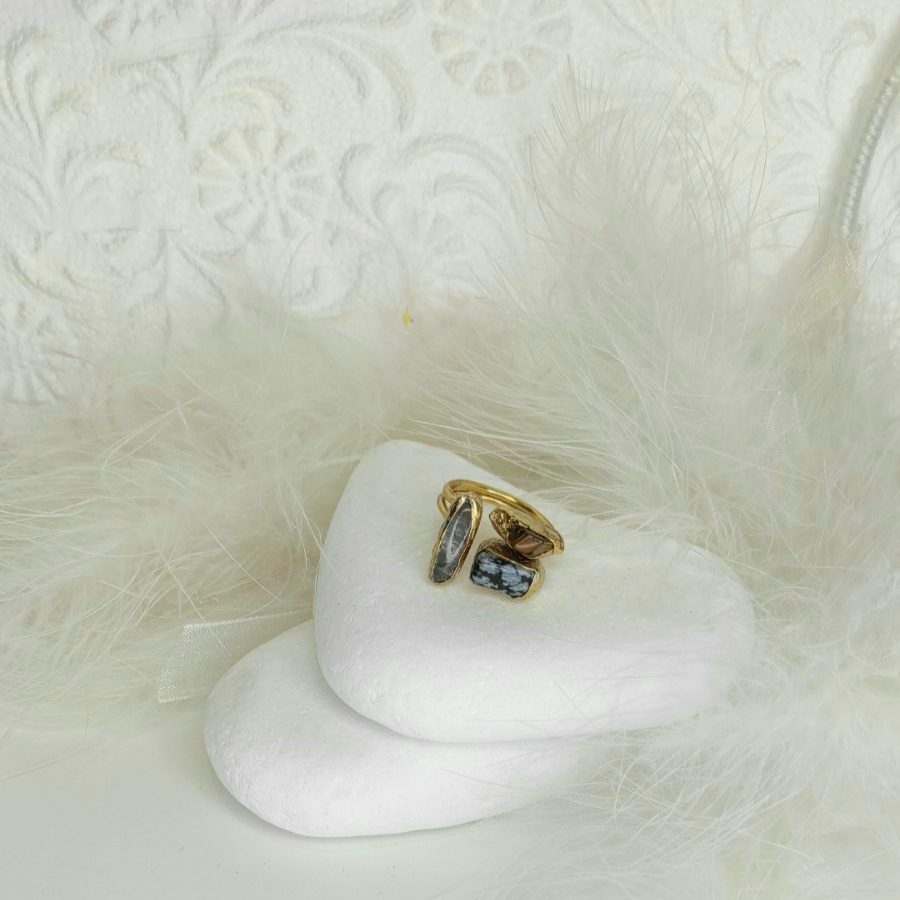 Μοναδικό Επιχρυσωμένο Δαχτυλίδι διακοσμημένο με 3 διαφορετικές πέτρες από φυσικά ορυκτά. H επιχρύσωση γίνεται χωρίς νικέλιο (υποαλλεργικό) και είναι λουστραρισμένο προστατεύοντας το κόσμημα από την οξείδωση. Προσαρμοζόμενο Μέγεθος 7-21cm.