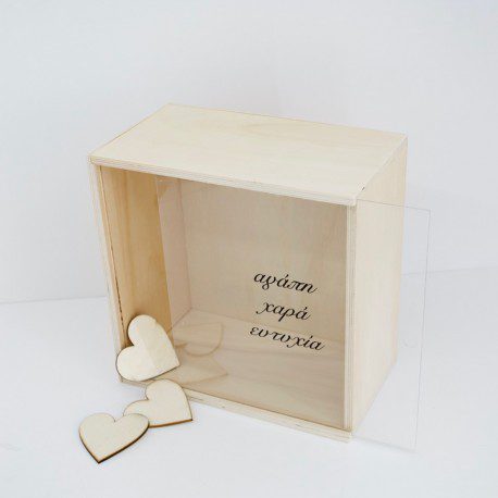 Κάδρο ευχών με 50 ξύλινες καρδούλες και plexiglass. Διαστάσεις: Ύψος 12,5cm x Μήκος 22cm
