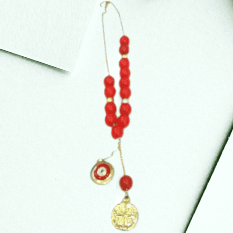 Κομπολόι επιχρυσωμένο διακοσμημένο με κόκκινους ημιπολύτιμους λίθους. Διακοσμητικό ματάκι. Μήκος 28 εκ. Ιδανικό δώρο για τον άνδρα!