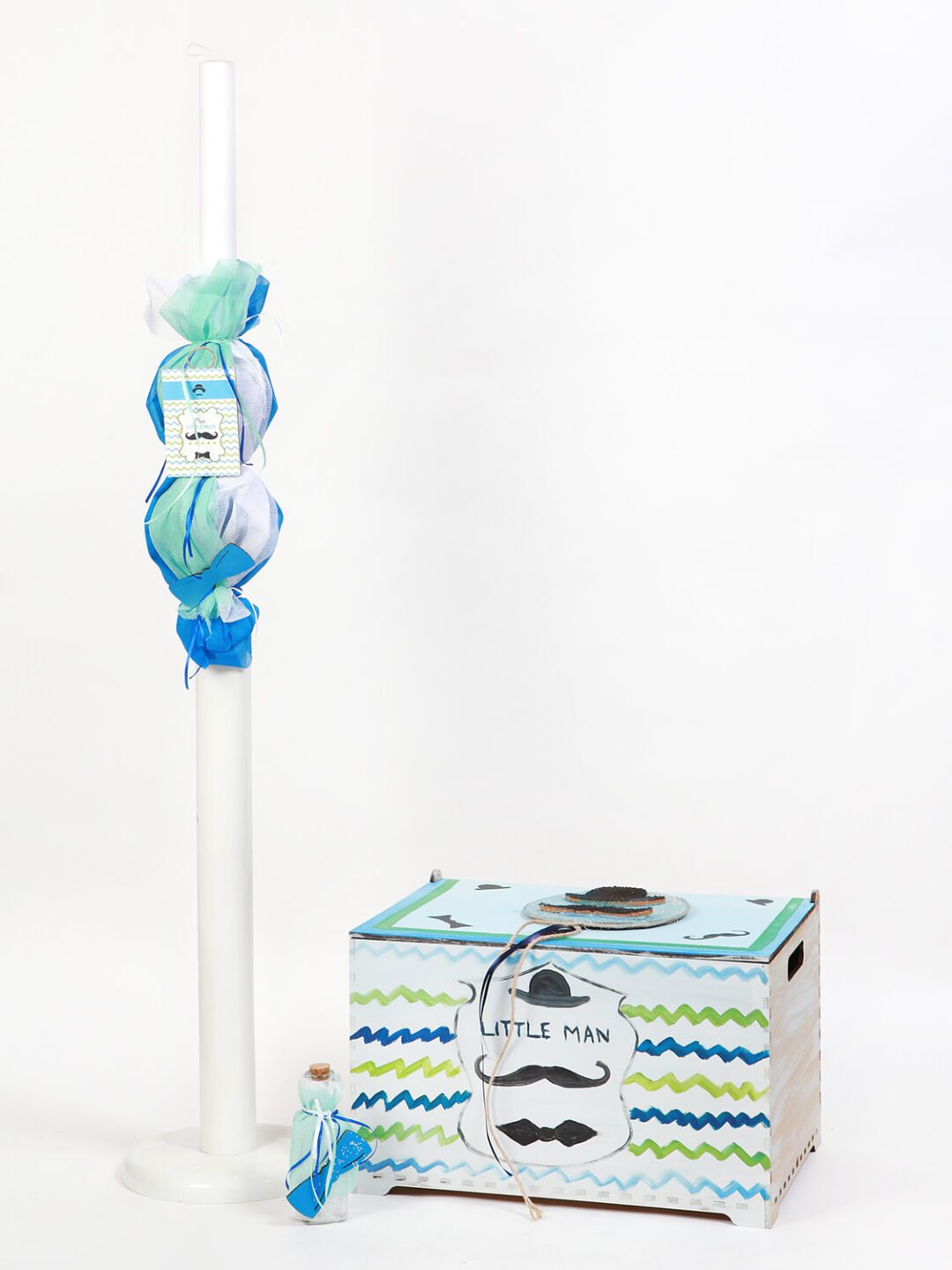 Κουτί ξύλινο ορθογώνιο αντικέ off white, ζωγραφισμένο στο χέρι*, καπάκι από πάνω, με θέμα Little Man, λεπτομέρειες μουστάκια, παπιγιόν και κορδέλες. Το σετ περιλαμβάνει στολισμό λαμπάδας (δεν συμπεριλαμβάνεται το κερί), 50 μαρτυρικά, 3 κεράκια, μπουκάλι λαδιού, σαπουνάκι, πετσέτες, σετ λαδόπανα και εσώρουχα. *Tο σετ βάπτισης είναι χειροποίητο και χρειάζεται 10-12 ημέρες παράδοσης.
