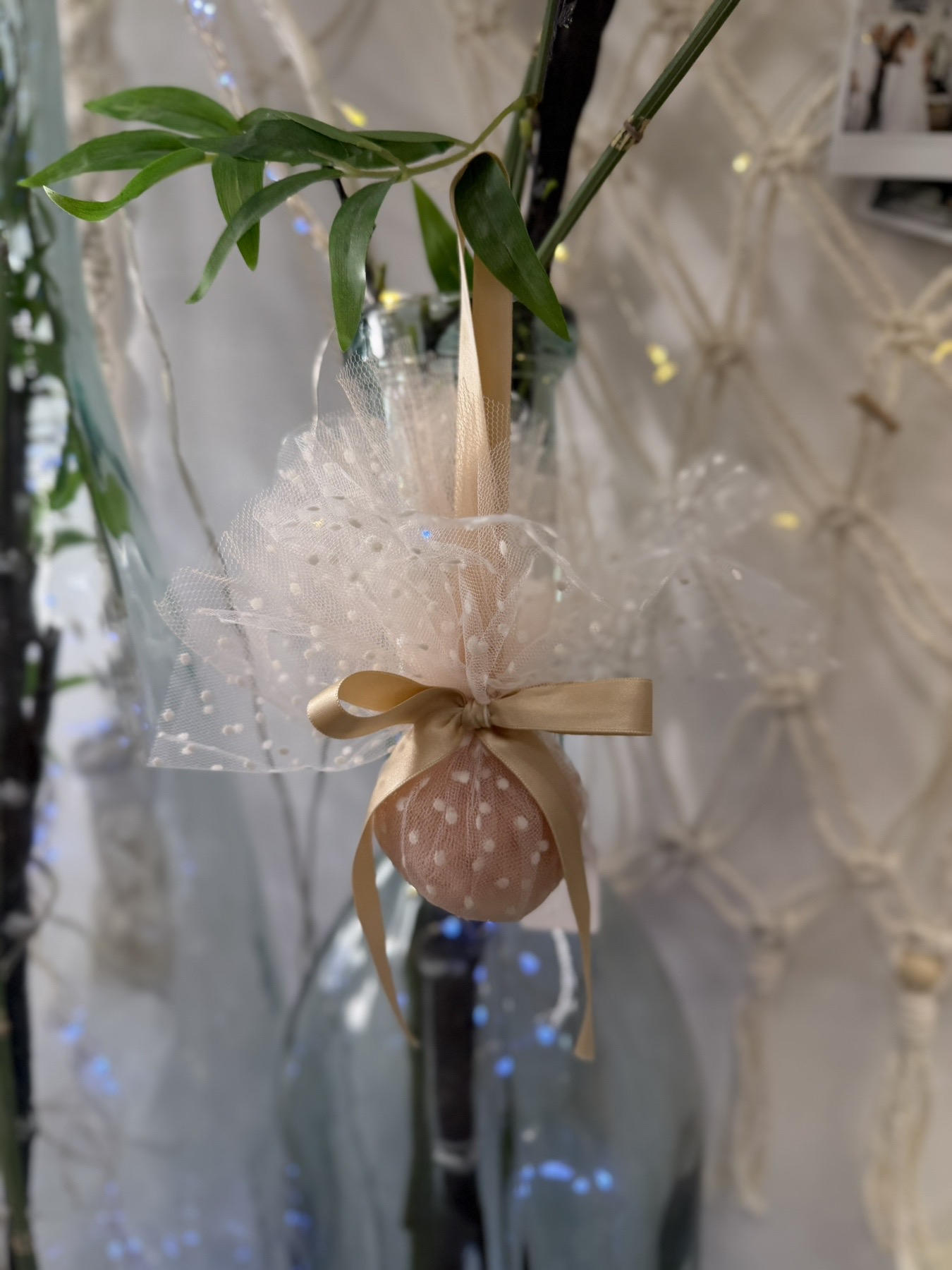 Κρεμαστή Μπομπονιέρα Βάπτισης . Διαθέτει πουά τούλι και την κορδέλα τησ επιλογής σας.