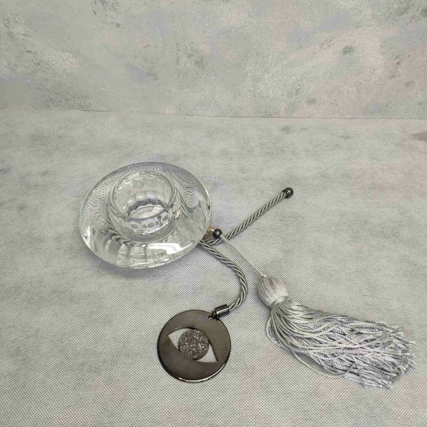Κρυστάλλινο κηροπήγιο με γούρι 2023 Μάτι και γκρι μεταξωτή φούντα με σατέν κορδόνι. Διάμετρος 13 εκ. γούρι 22εκ. Χειροποίητο και κατασκευασμένο στην Ελλάδα