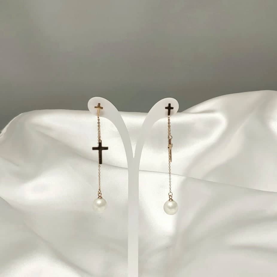 • Μακριά σκουλαρίκια με σταυρουδάκια και πέρλες