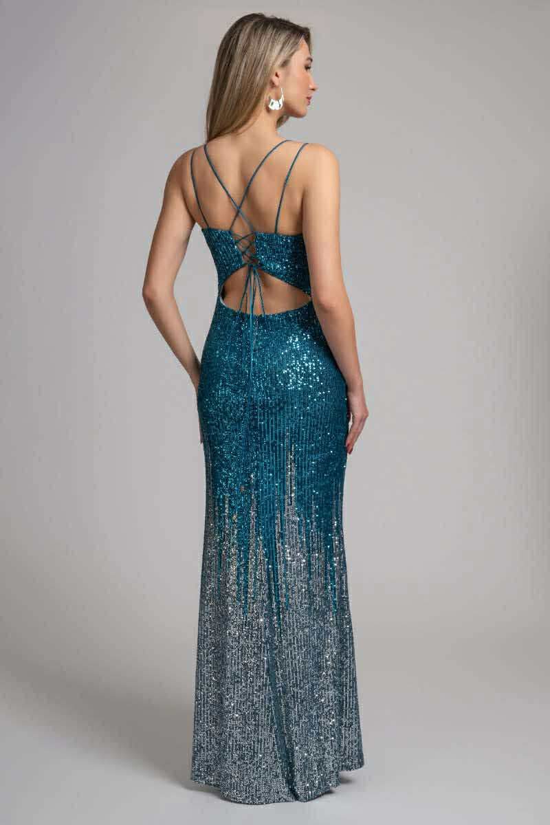 Μακρύ φόρεμα με παγιέτα και σκίσιμο. Διαθέτει λεπτές τιράντες και βαθύ ντεκολτέ με διακριτικό τούλι στο στήθος για σταθερότητα και κομψότητα.