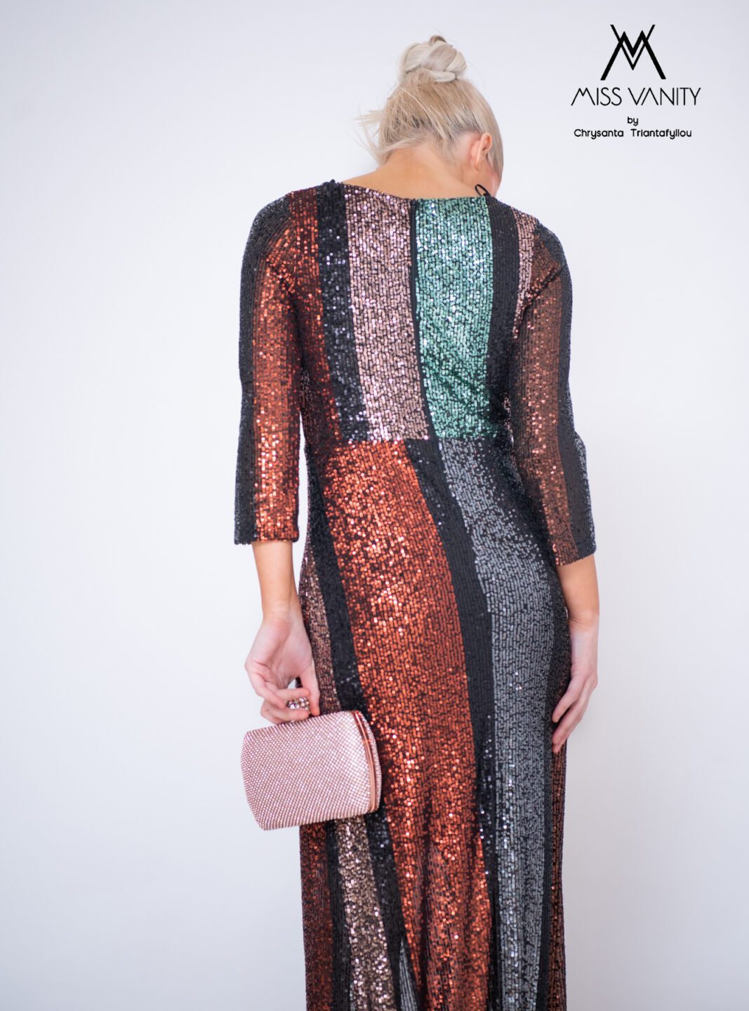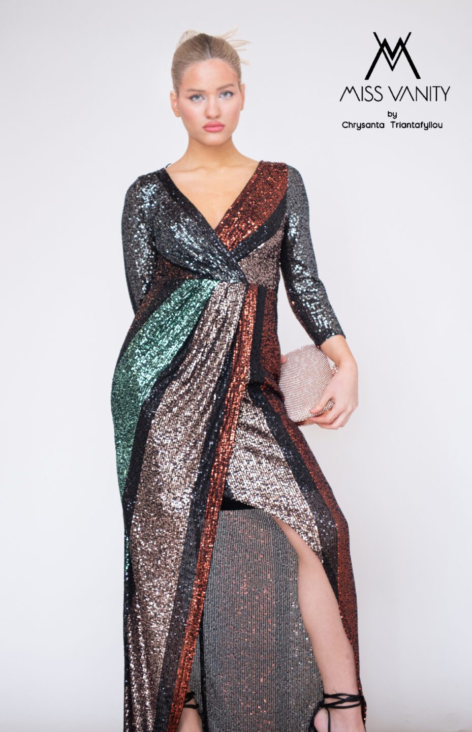 Μακρύ φόρεμα με παγιέτες σε 3 χρώματα, μαύρο ασημί και μπρονζέ σε ρίγες. Μπούστο κρουαζέ, μακρύ μανίκι και σκίσιμο μπροστά. Ένα εντυπωσιακό φόρεμα! Ελληνικής κατασκευής.