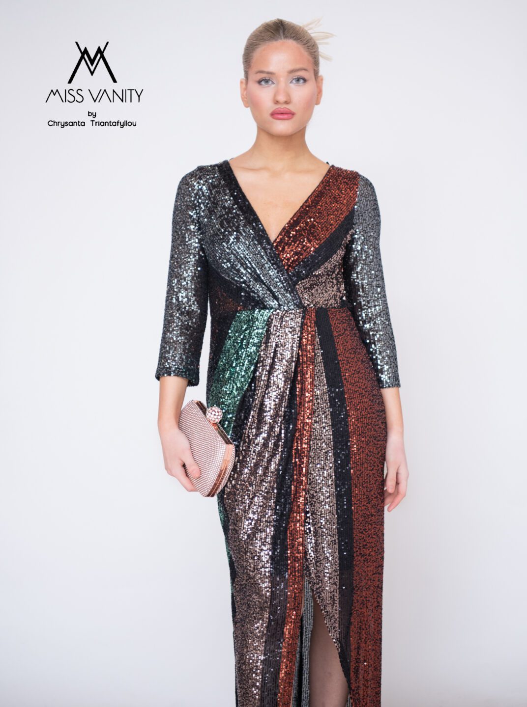 Μακρύ φόρεμα με παγιέτες σε 3 χρώματα, μαύρο ασημί και μπρονζέ σε ρίγες. Μπούστο κρουαζέ, μακρύ μανίκι και σκίσιμο μπροστά. Ένα εντυπωσιακό φόρεμα!