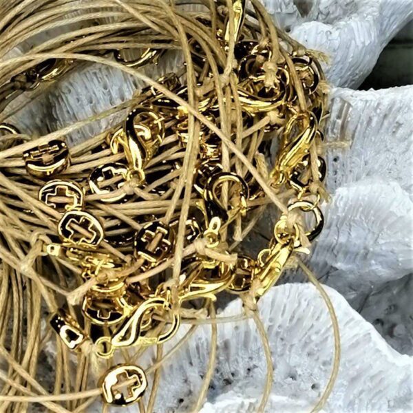 Μαρτυρικά βραχιολάκια για βάπτιση με μεταλλική χάντρα και διάτρητο σταυρουδάκι, κούμπωμα με χρυσό παπαγαλάκι. Η επιλογή χρώματος στο κορδονάκι και τις χάντρες είναι δική σας. Το κουτί περιλαμβάνει 50 τεμάχια. Είναι χειροποίητα και η παράδοση τους γίνεται σε 10-12 ημέρες.