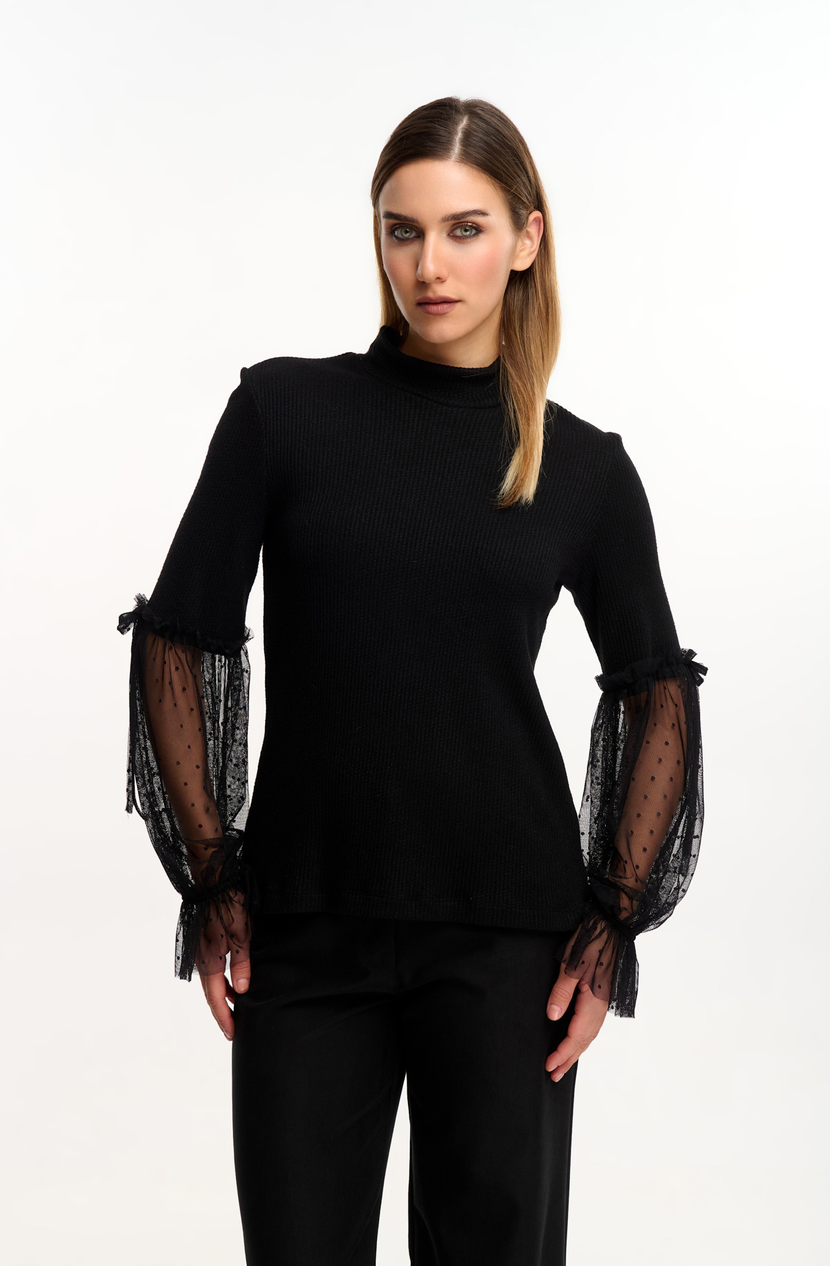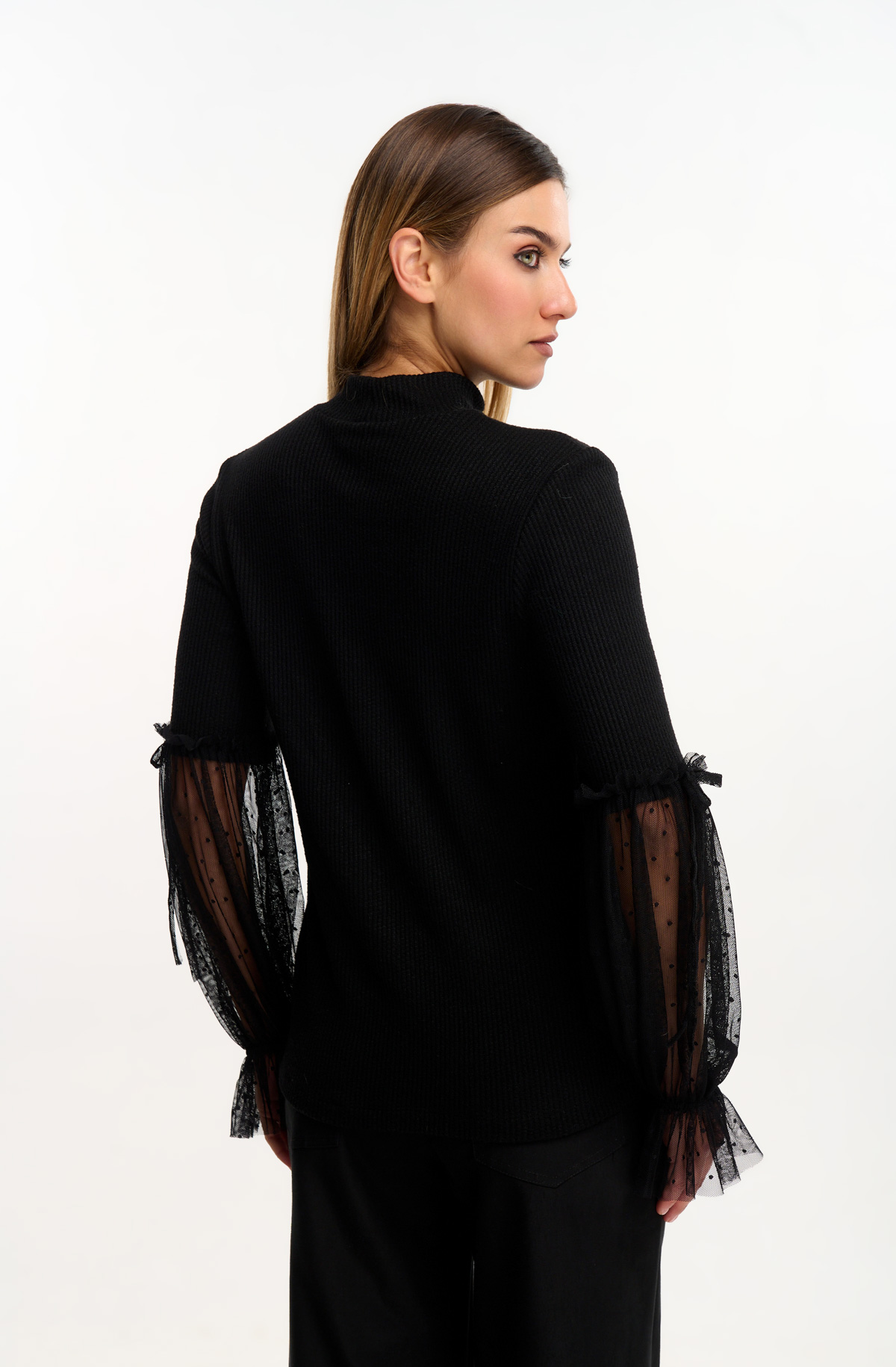 Μαύρη γυναικεία μπλούζα με μανίκια. Διαθέτει διαφάνεια στα μανίκια από τον αγώνα και κάτω . Είναι ελληνικής κατασκευής.