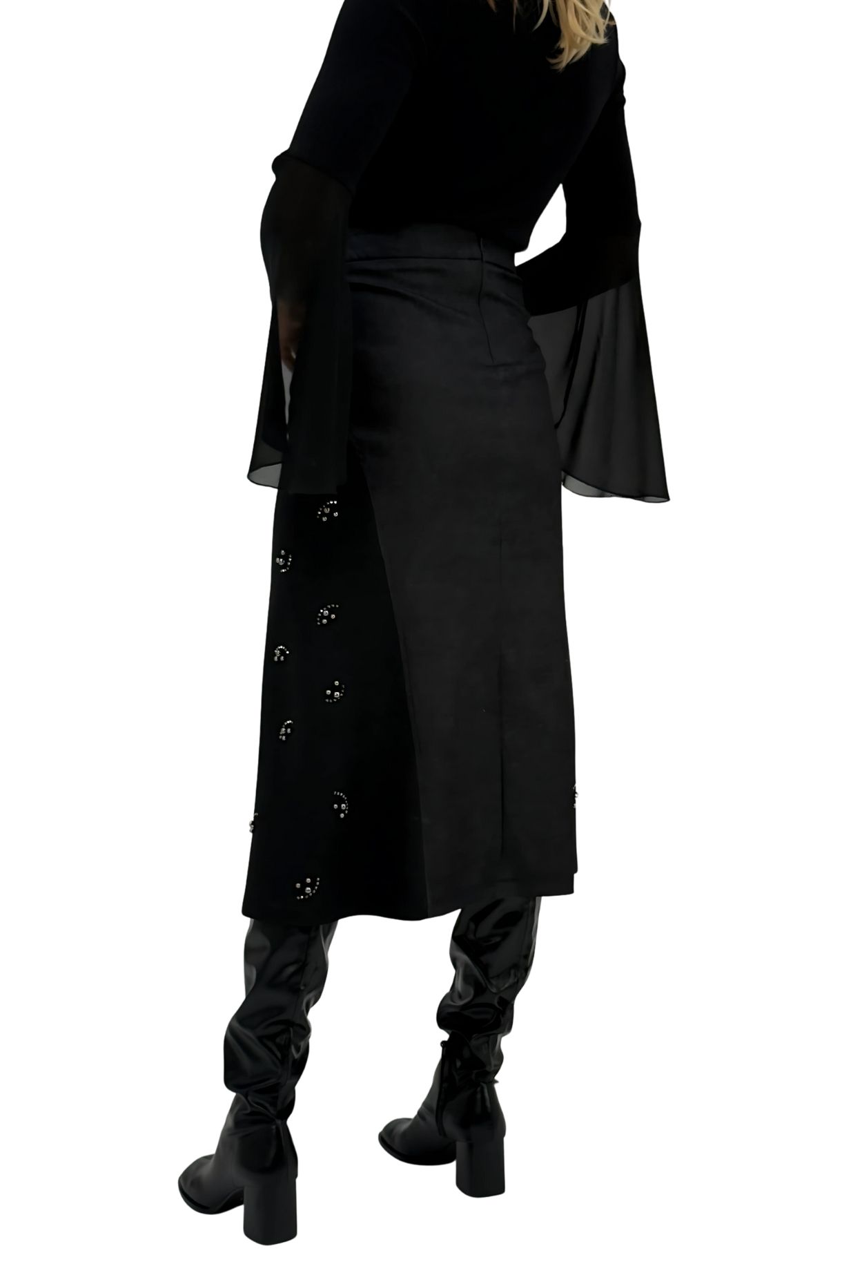 Μαύρη μακριά τζιν φούστα με κεντήματα. Με τρουκς και strass και από τις δύο μεριές. Κουμπώνει με φερμουάρ. Είναι ελληνικής κατασκευής.