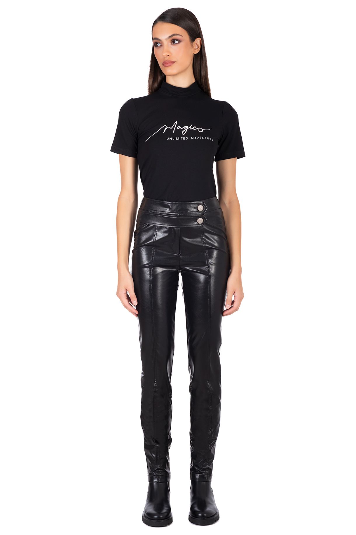 Μαύρο δερμάτινο παντελόνι με διπλή ζώνη. Με εσωτερική βισκόζ επένδυση. Διαθέτει λάστιχο στην μέση, διπλή ζώνη με εσωτερικό κούμπωμα και φερμουάρ μπροστά. Είναι ελληνικής κατασκευής.