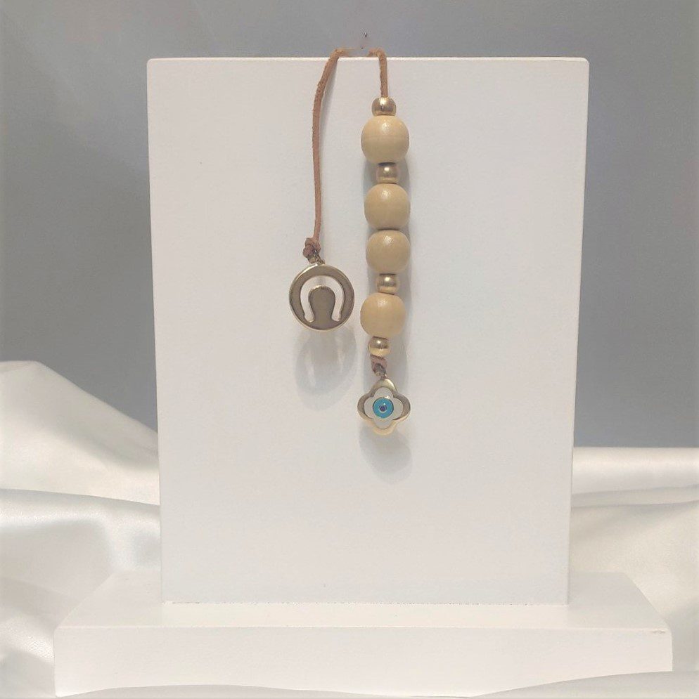Μεγάλο μπεγλέρι με επίχρυσα στοιχεία και ξύλινα, ματάκι και εκρού χάντρες. Διάσταση 26 εκ. Χειροποίητο και κατασκευασμένο στην Ελλάδα