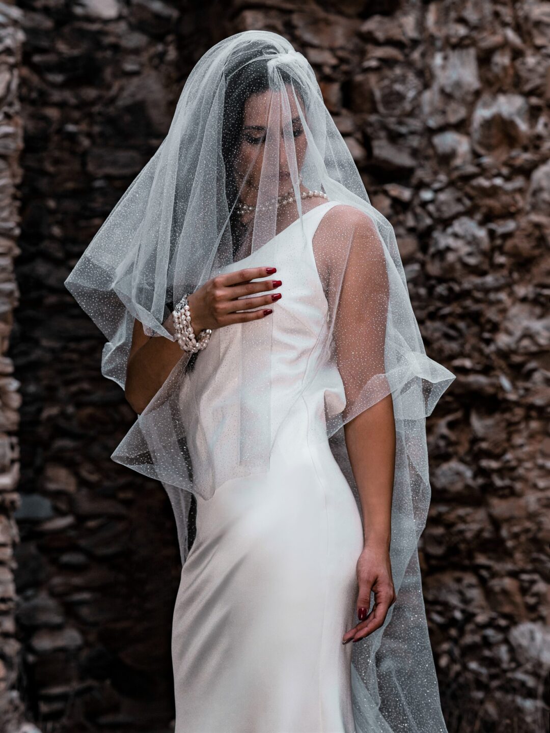Μεταξωτό νυφικό με εντυπωσιακή ανοιχτή πλάτη μέχρι τη μέση, με ουρά μακριά και τελείωμα δαντέλα. Κανονικό μπούστο με τιράντα.