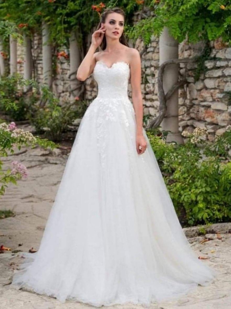 Ρομαντικό νυφικό σε Άλφα γραμμή με κεντημένο μπούστο από υπέροχη γαλλική δαντέλα και φούστα από πλούσιο γαλλικό τούλι. Μπούστο στράπλες όπου μπορούμε να προσαρμόσουμε τιραντάκι. Ελληνικής ραφής