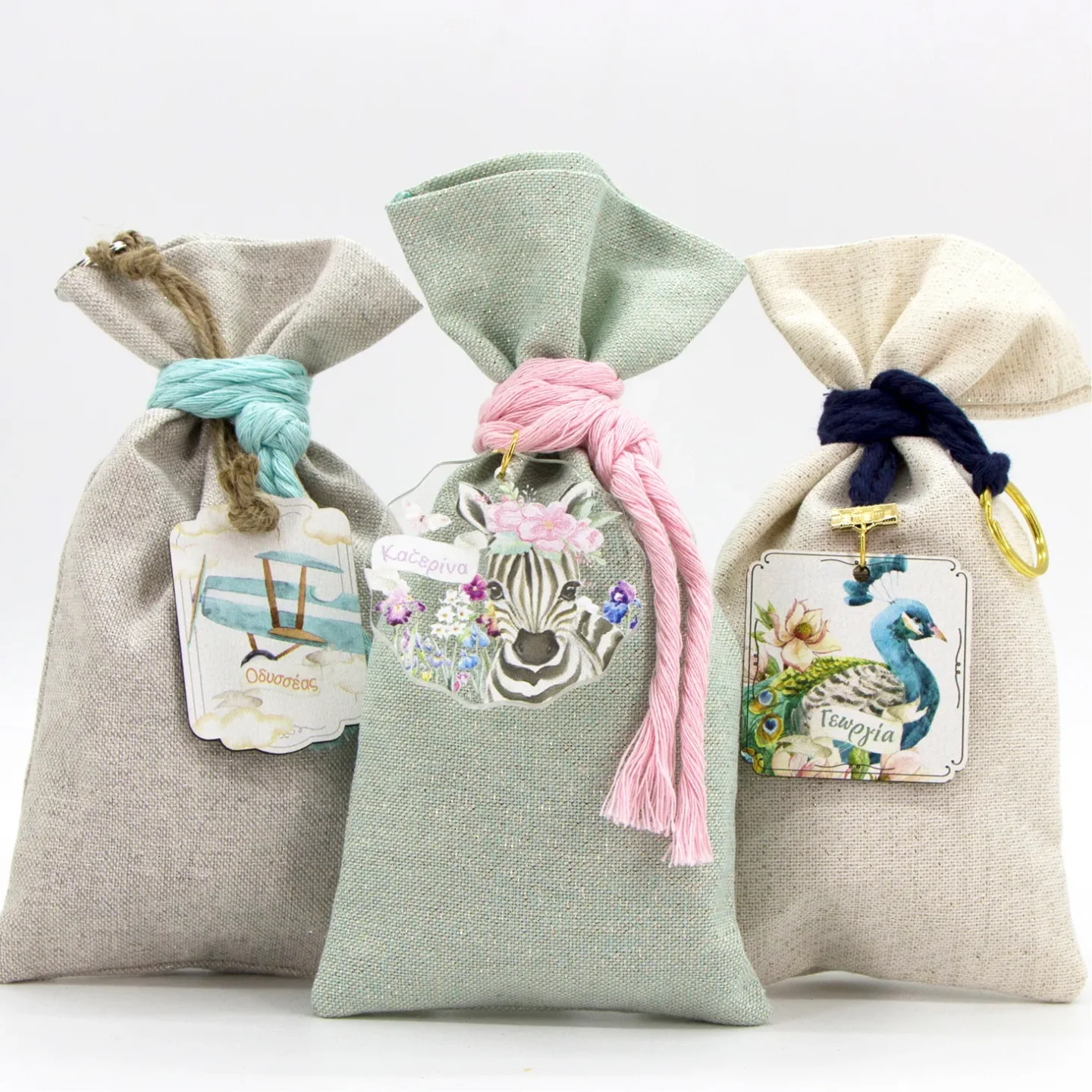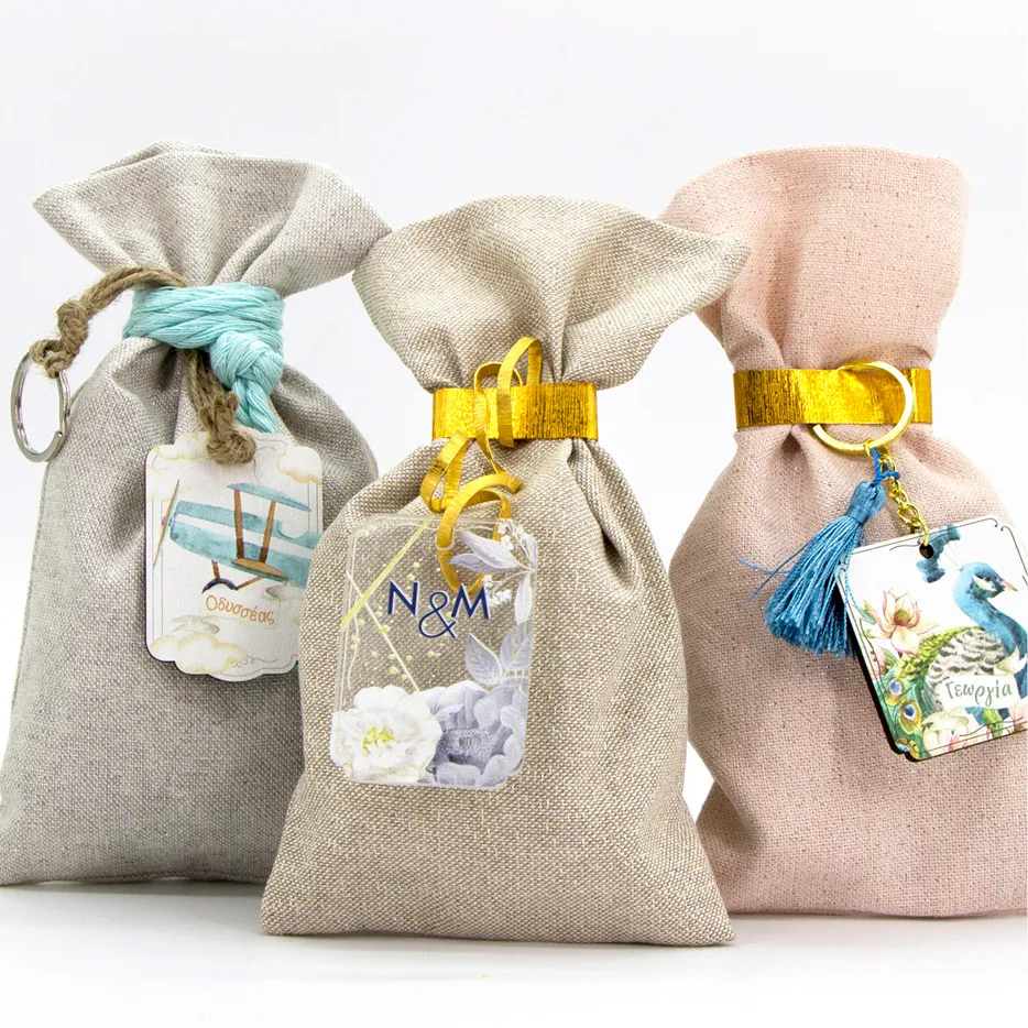 Μονόχρωμο υφασµάτινο πουγκί (Lurex 200gr), διάστασης 12×22εκ και ετικέτα (μακετόχαρτο, ξύλο ή plexiglass) τυπωμένη στο θέμα του μυστηρίου. Διατίθεται σε 5 χρώματα για το ύφασμα και 3 κοπτικά περιγράμματα επιλογής για τις ετικέτες.