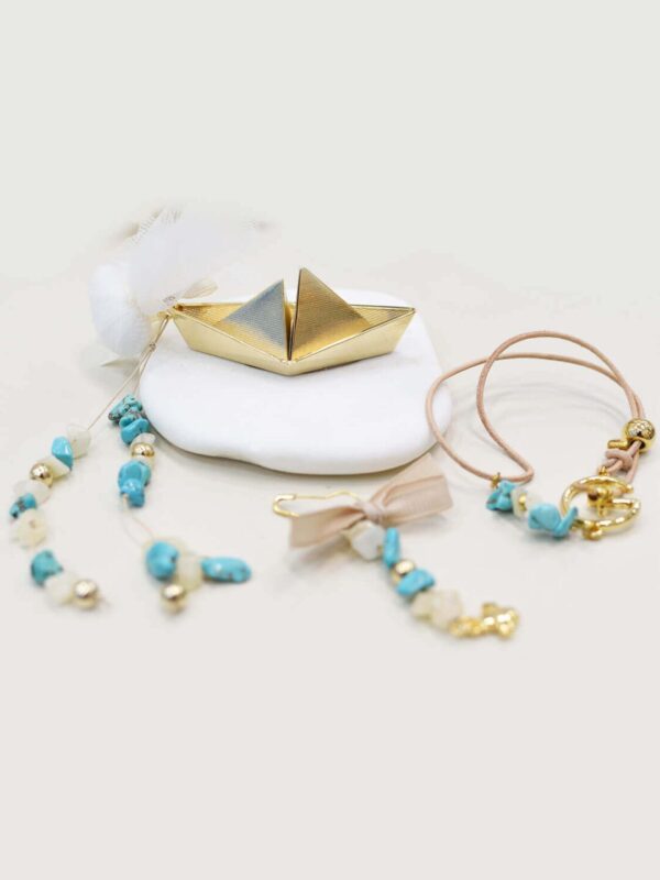 Μπομπονιέρα με καραβάκι σε πέτρα με διακοσμητικές χάντρες και ημιπολύτιμους λίθους, επιχρυσωμένο με 24 καράτια, κατασκευασμένη εξολοκλήρου στην Ελλάδα. Ελάχιστη παραγγελία 50 τεμάχια. Ιδιαίτερες μπομπονιέρες σχεδιασμένες για να εντυπωσιάσουν στη σημαντικότερη στιγμή της ζωής σας.