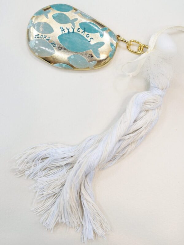 Μπομπονιέρα βάπτισης με χρυσό διακοσμητικό ζωγραφισμένο με ψάρια και λευκή φούντα, επιχρυσωμένο με 24 καράτια, κατασκευασμένη εξολοκλήρου στην Ελλάδα. Ελάχιστη παραγγελία 50 τεμάχια. Ιδιαίτερες μπομπονιέρες σχεδιασμένες για να εντυπωσιάσουν στη σημαντικότερη στιγμή της ζωής σας.