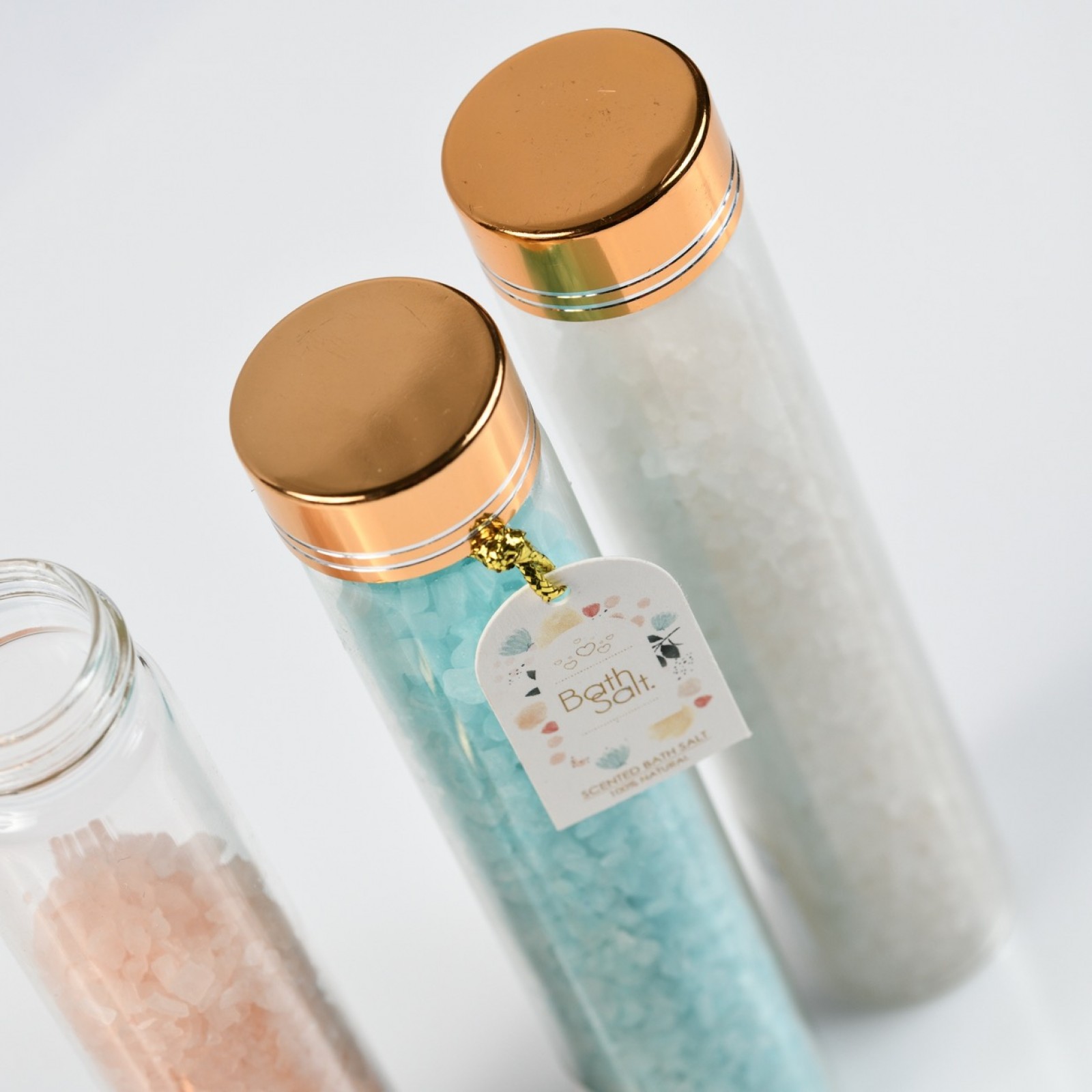 Μπομπονιέρα δοκιμαστικός σωλήνας με αρωματικά άλατα. Με χρυσό καπάκι. Διαστάσεις 10x3cm. Χρώματα : λευκό, γαλάζιο, βεραμάν, aqua, πετρόλ, navy blue, ιβουάρ, κίτρινο, ροζ, σάπιο μήλο, σομόν