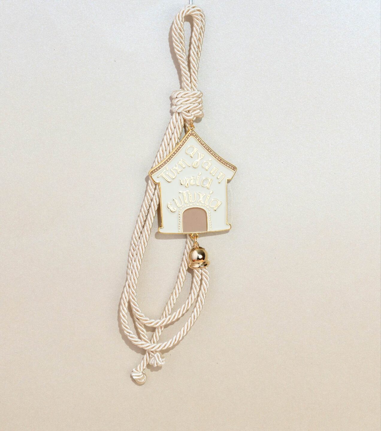 Μπομπονιέρα κρεμαστή με σπιτάκι επιχρυσωμένο με 24 Καράτια και μεταξωτό κορδόνι. Παραδίδεται έτοιμη δεμένη με κουφέτα. Ελάχιστη παραγγελία 50 τεμάχια.