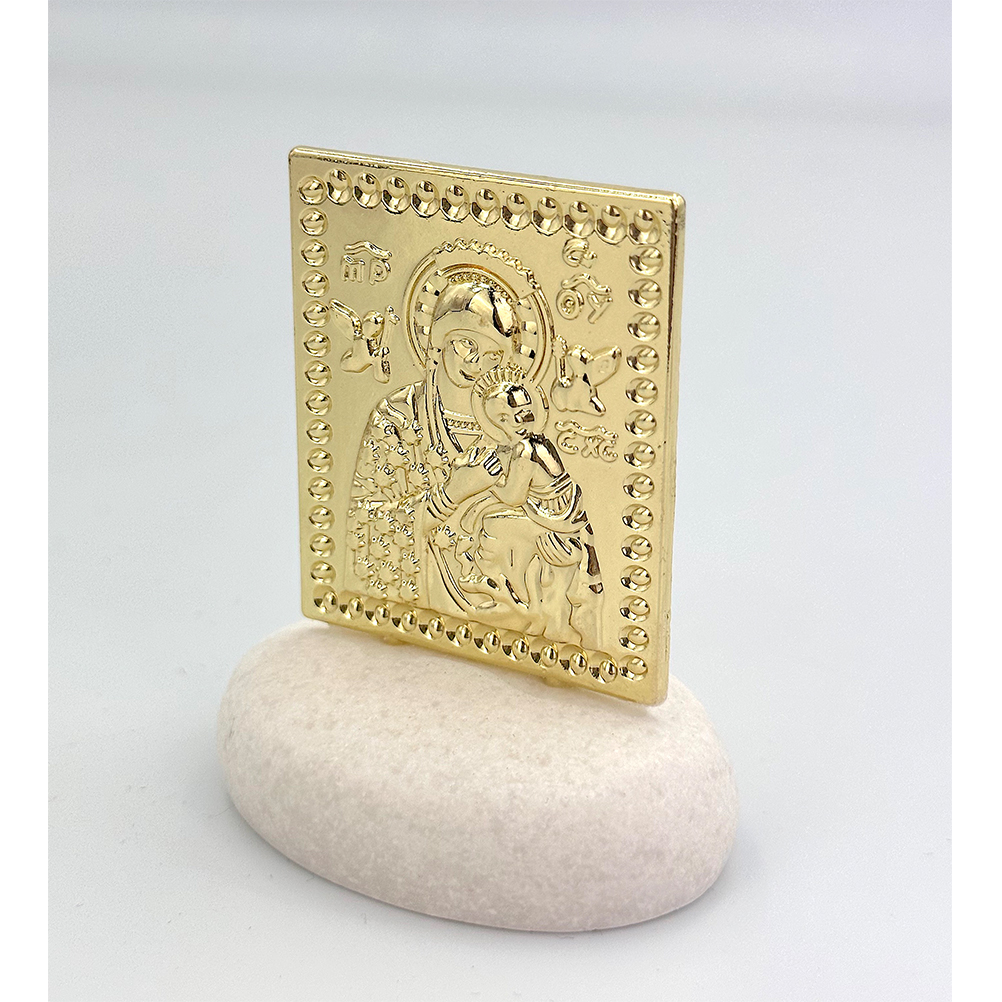 Μπομπονιέρα με λευκό βότσαλο και επίχρυσο διακοσμητικό με την Παναγία. Παραδίδεται έτοιμη δεμένη με κουφέτα. Διαστάσεις  ύψος 10εκ. πλάτος 8εκ. Ελάχιστη παραγγελία 50 τεμάχια.