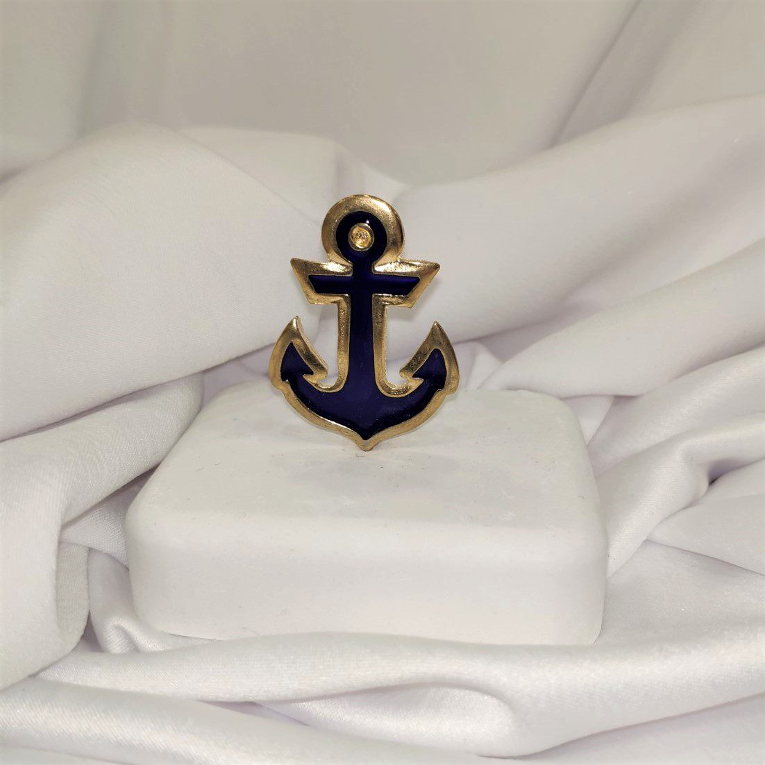 Μπομπονιέρα βάπτισης με λευκό βότσαλο και επίχρυσο διακοσμητικό με άγκυρα και μπλε επισμάλτωση. Παραδίδεται έτοιμη δεμένη με κουφέτα. Διαστάσεις  ύψος 10εκ. πλάτος 8εκ. Ελάχιστη παραγγελία 20 τεμάχια.
