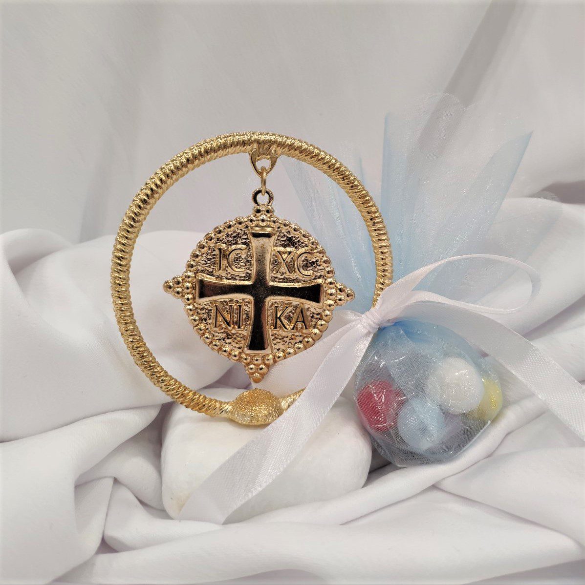• Μπομπονιέρα με λευκό βότσαλο και επίχρυσο Κωνσταντινάτο