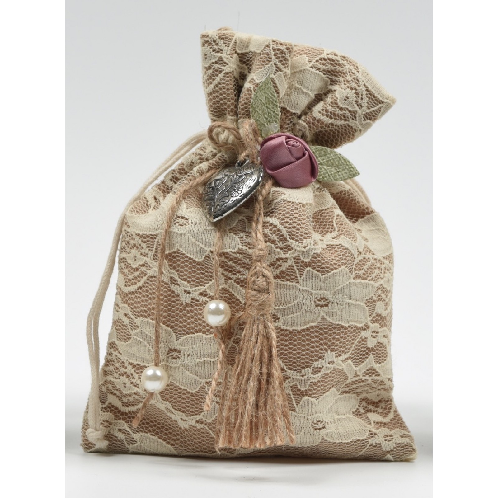 Μπομπονιέρα πουγκί στολισμένο με δαντέλα και σύνθεση από σατέν λουλούδι και μεταλλική καρδιά. Χρώμα μόκα. Διαστάσεις 13x18cm