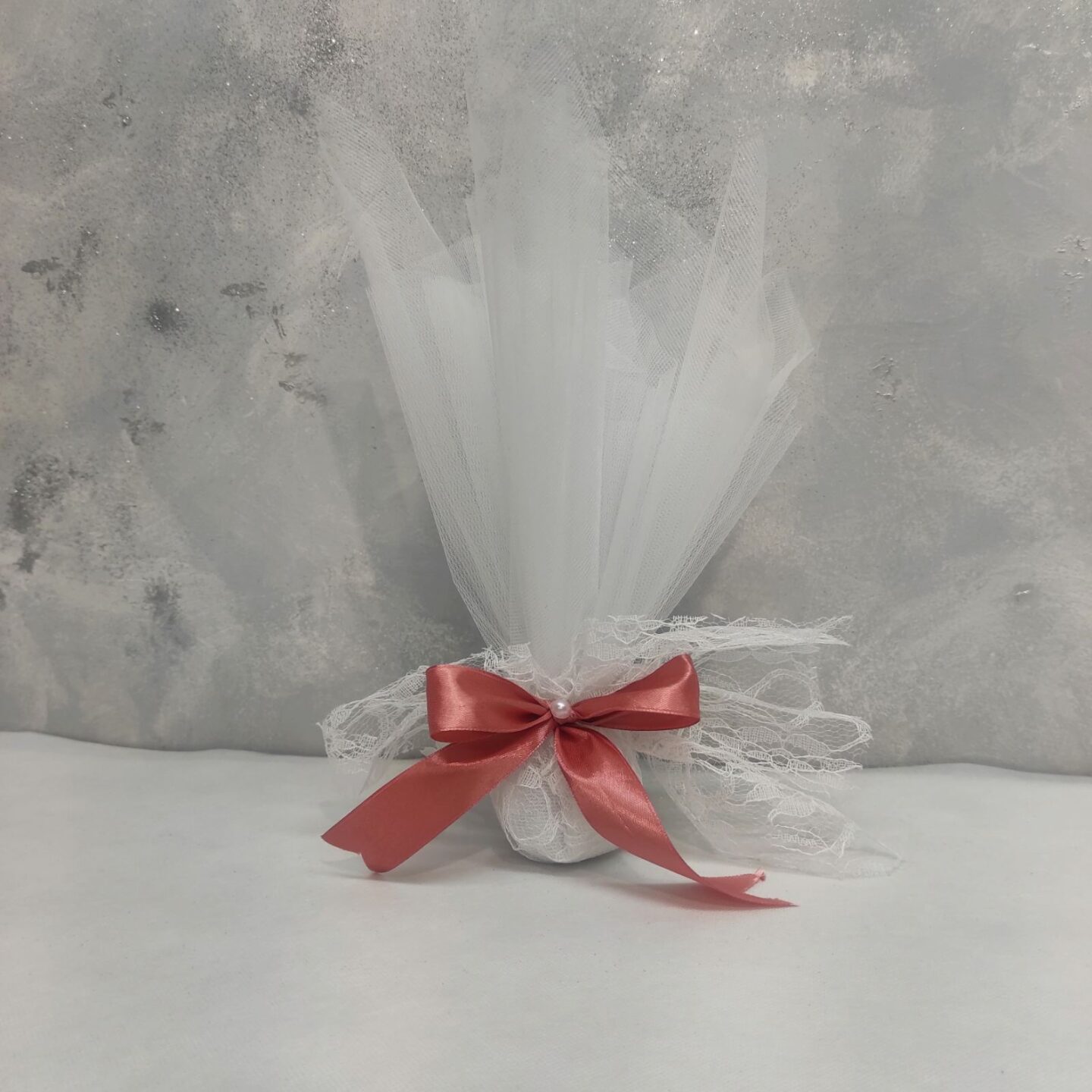 Μπομπονιέρα τούλινη με δαντέλα και σατέν κορδέλα με πέρλα. Ελάχιστη παραγγελία 20 τεμάχια