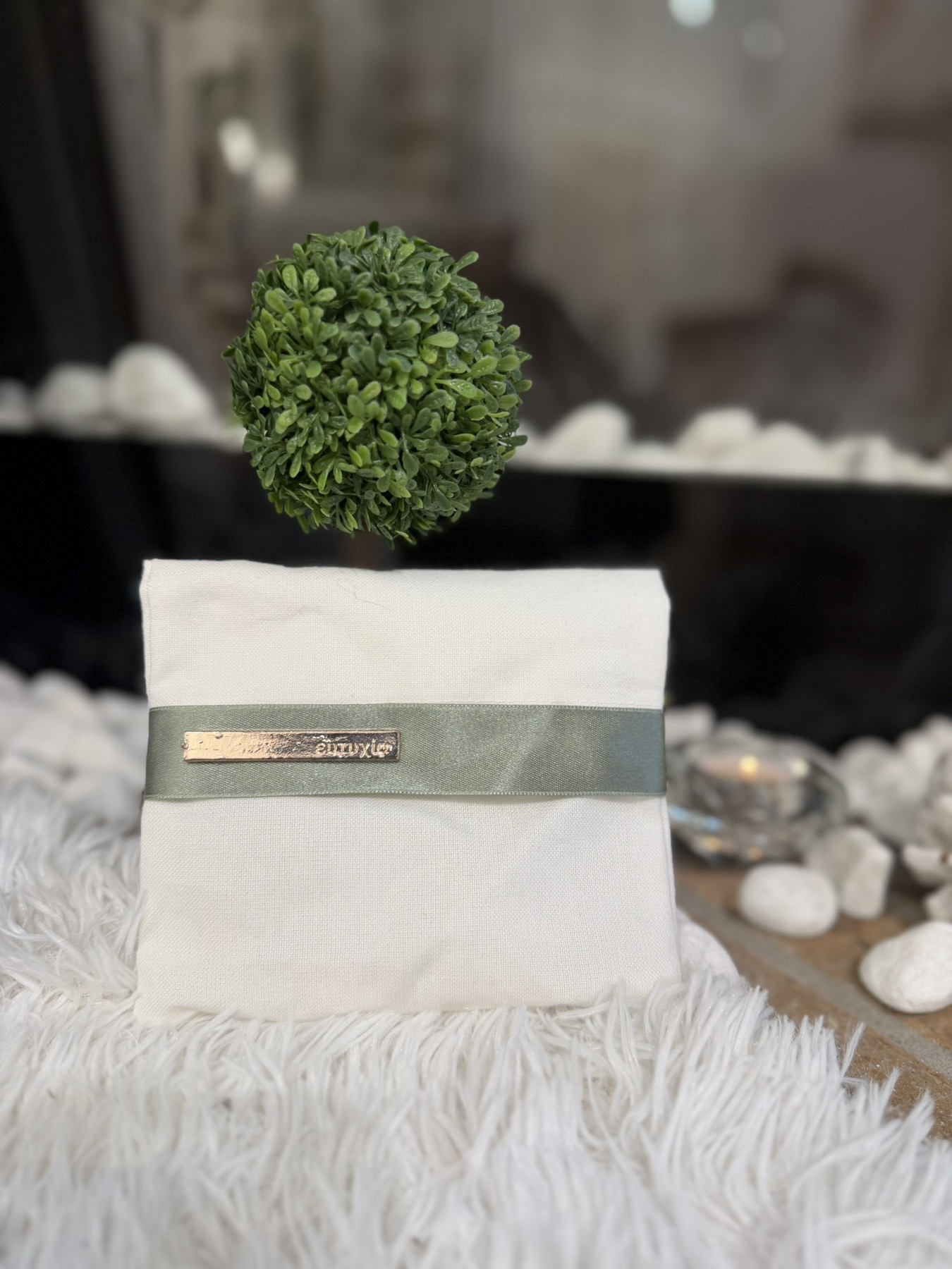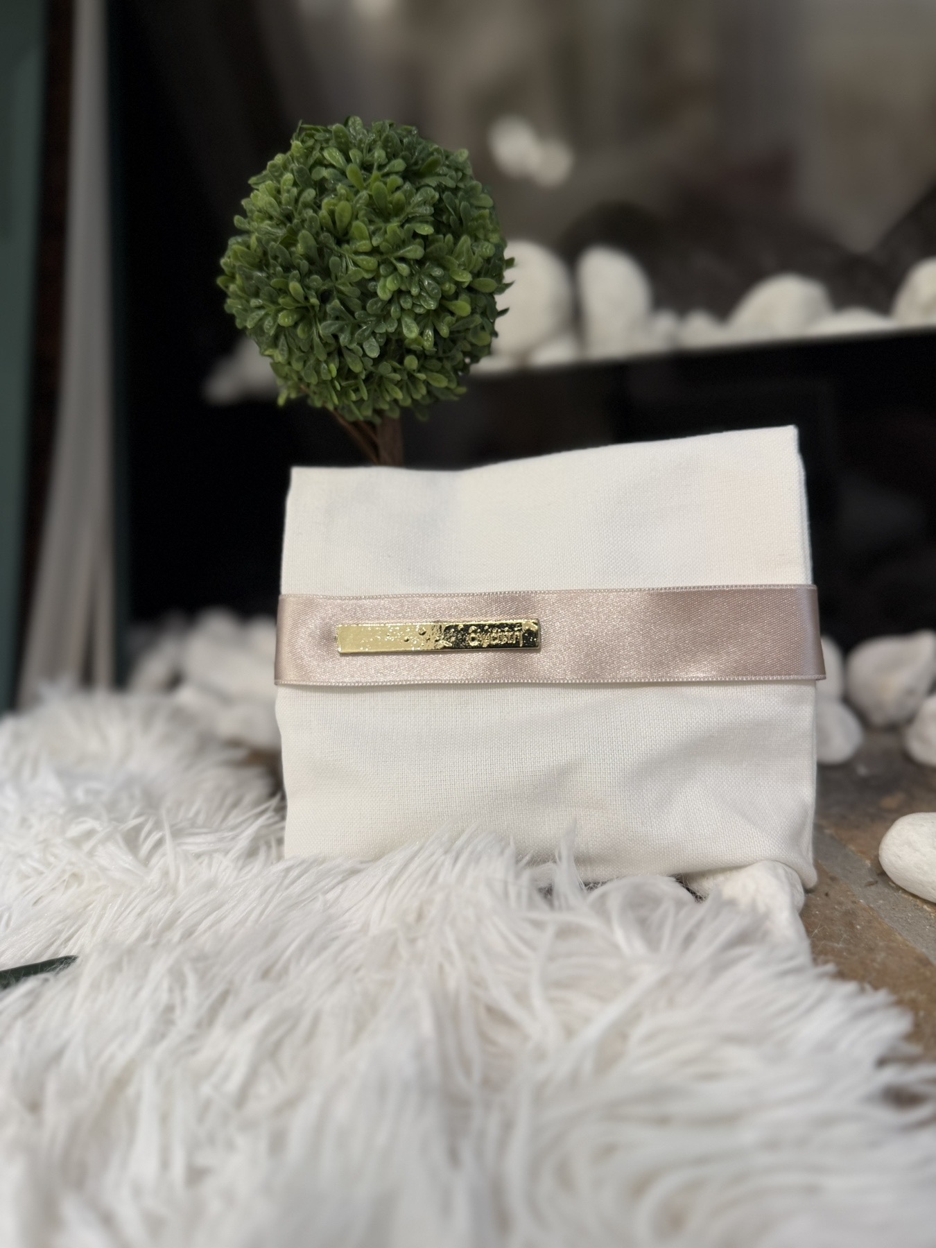 Μπομπονιέρες Βάπτισης – Γάμου υφασμάτινος φάκελος με μεταλλικό σχέδιο . Και την κορδέλα της επιλογής σας.