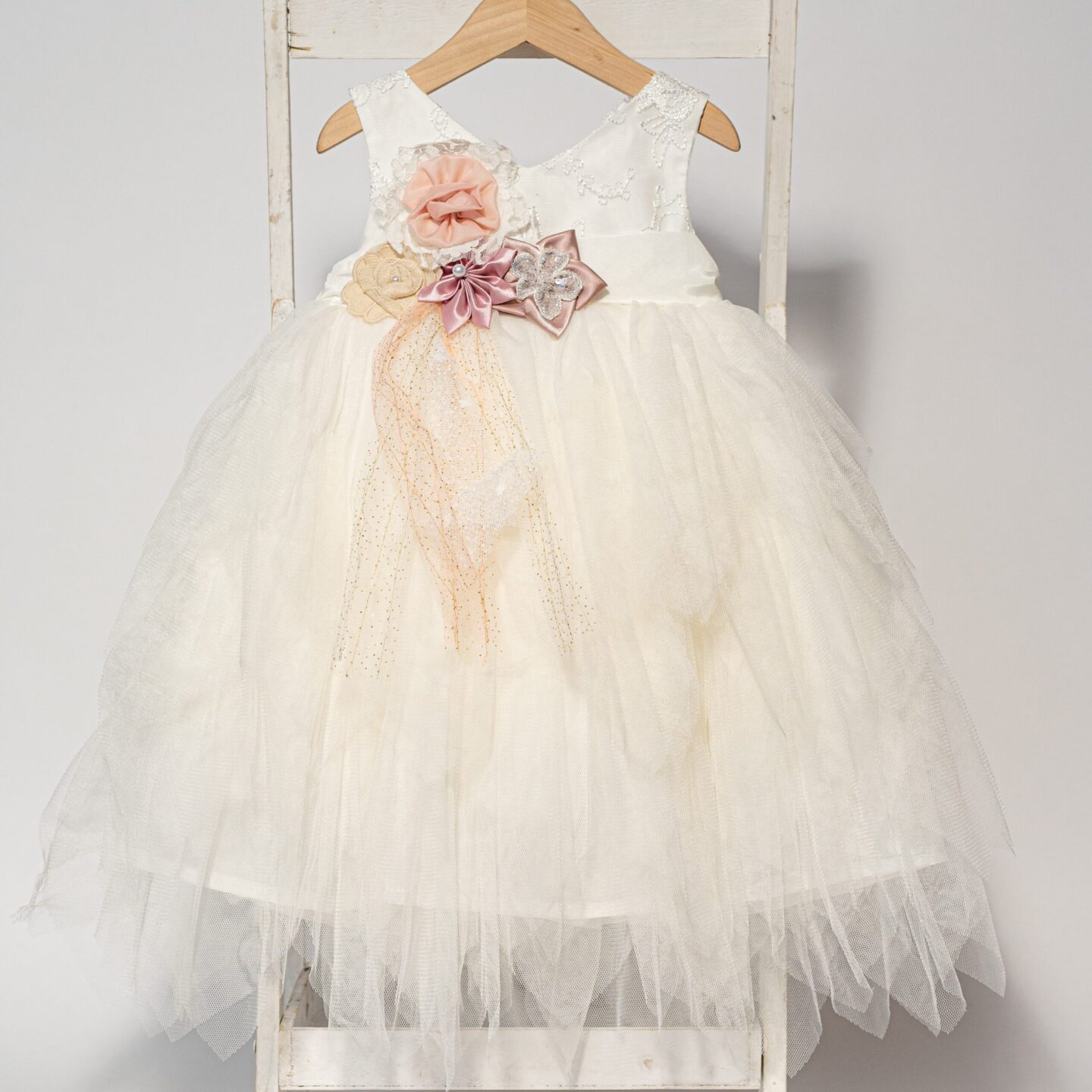 Νεραϊδένιο βαπτιστικό φόρεμα με ασύμμετρο άσπρο γαλλικό τούλι. Σε περίπτωση έλλειψης αποθέματος απαιτούνται έως 15 εργάσιμες για την παραγωγή του