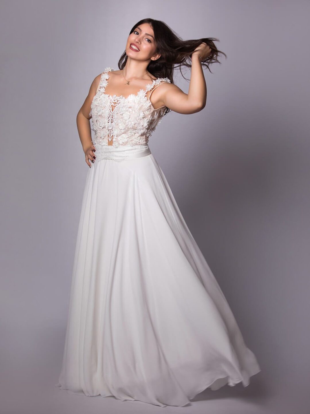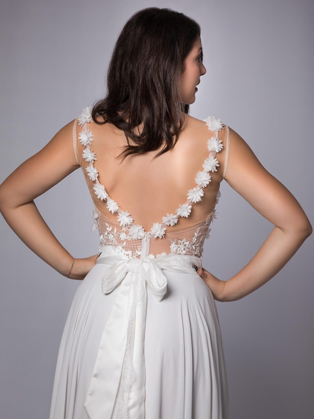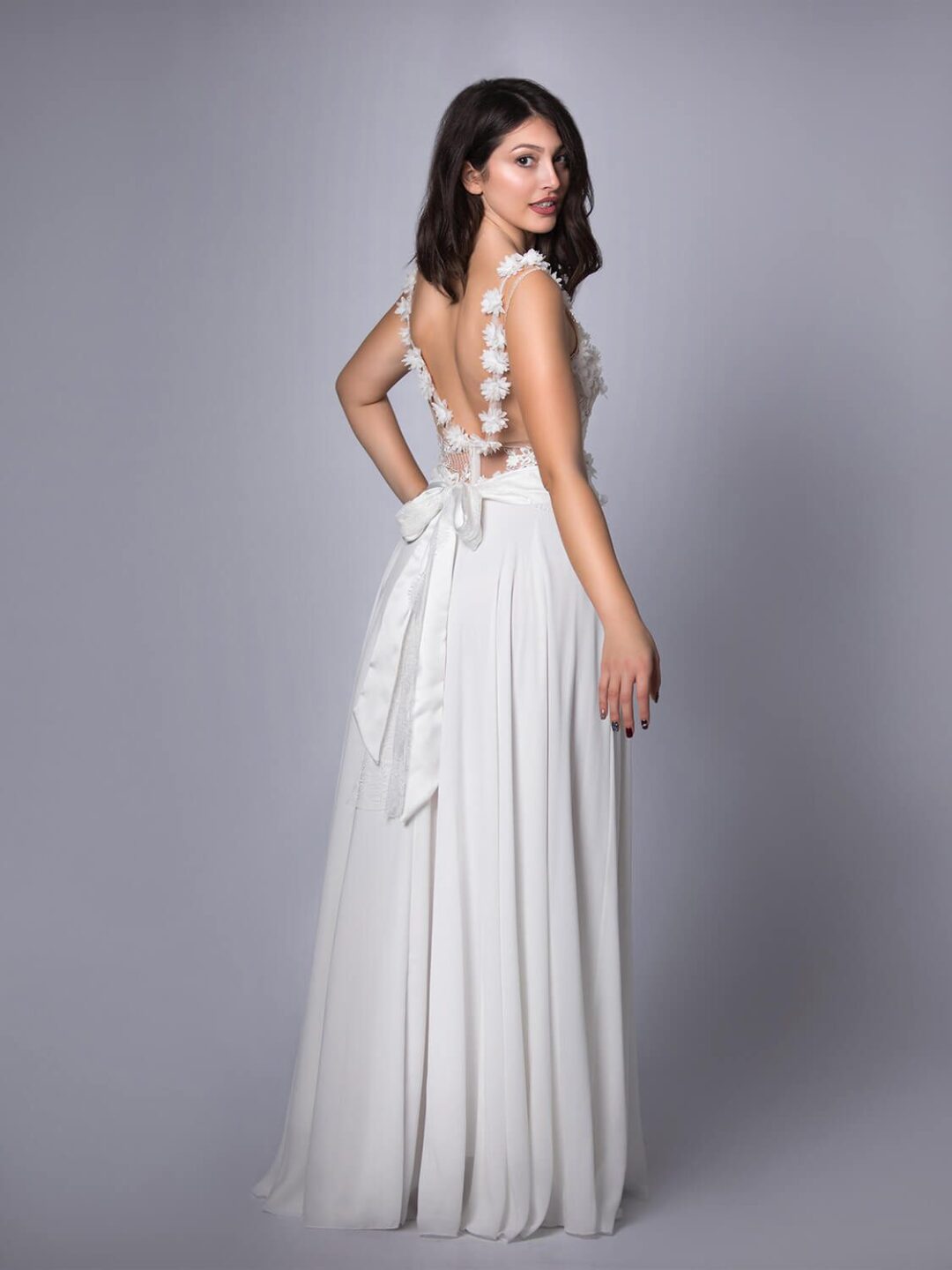 Νυφικό από μεταξωτή μουσελίνα και ανοιχτή πλάτη, σε άλφα γραμμή με ολοκέντητο από λουλούδια δαντελένιο μπούστο. Το νυφικό έχει εντυπωσιακή πλάτη με V τελείωμα, κεντημένη με λουλούδια. Ζώνη με τελείωμα φιόγκο στο πίσω μέρος. Ιδανικό για νύφες σε νούμερο S / M με κανονικό στήθος. Ένα νυφικό από μεταξωτή μουσελίνα και καταπληκτικό άνοιγμα στη πλάτη, πολύ chic και εντυπωσιακό. Το νυφικό είναι μοναδικό και μόνο προς πώληση, όπως αρμόζει σε αυτή τη μοναδικά ξεχωριστή στιγμή της ζωής σου. Πολλές νύφες μας μας έχουν εμπιστευτεί και έχουν αγοράσει με τις συμβουλές μας το νυφικό τους online. Αν δεν είσαι σίγουρη για την εφαργαγή του μπορείς να κλείσεις ραντεβού για πρόβα στο info@missvanity.gr για να επισκεφτείς το φυσικό μας κατάστημα και κέρδισε 10% έκπτωση.