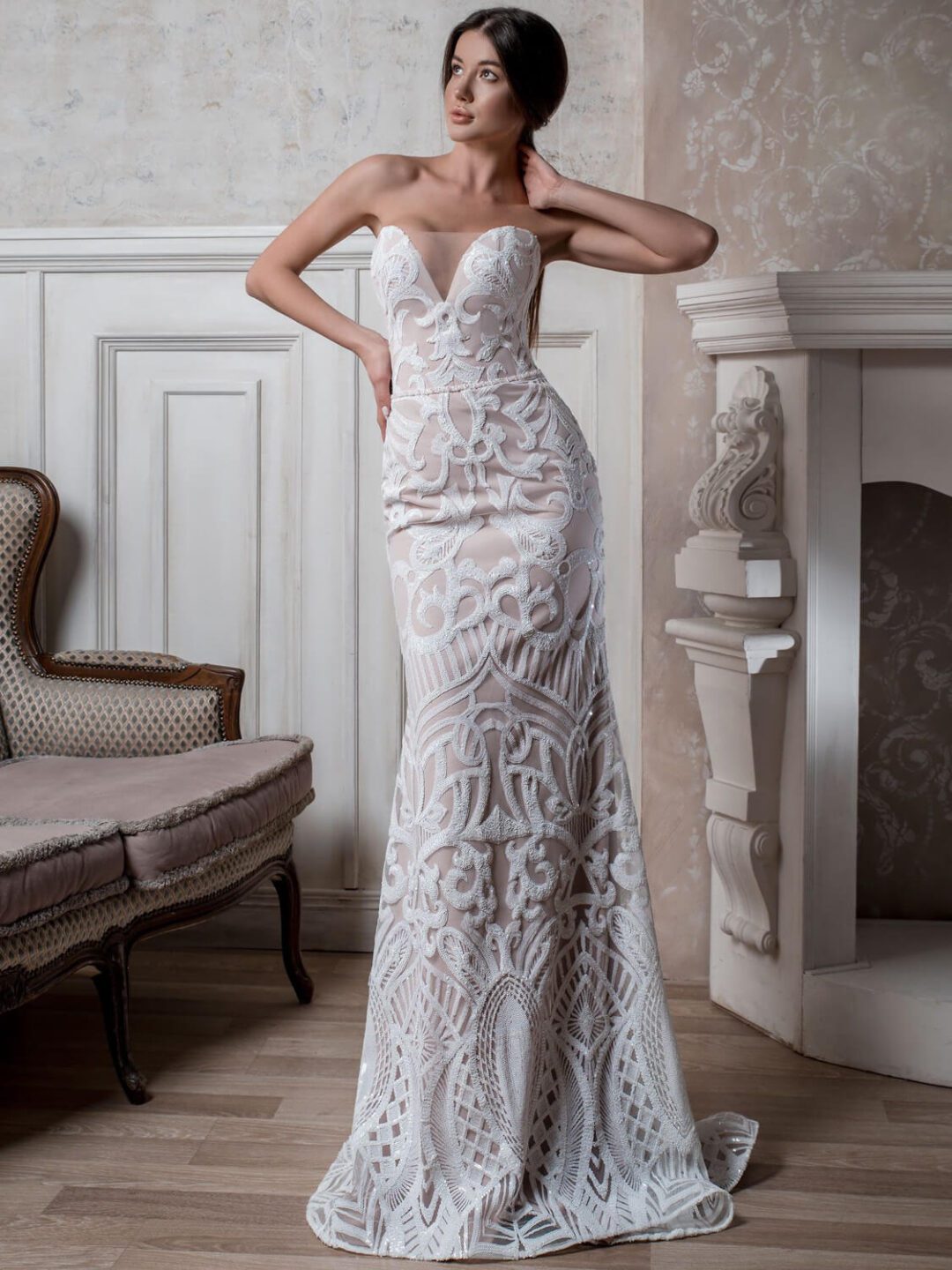 Νυφικό γοργονέ στράπλες με εντυπωσιακό κέντημα στο μπούστο από γαλλική ολοκέντητη με παγιέτα δαντέλα. Το μπούστο είναι σε σχήμα καρδιάς και διαφάνεια με άνοιγμα μπροστά με άψογη εφαρμογή. Απλικαρισμένο όλο με γαλλική δαντέλα και λεπτομέρεια με δέσιμο στο πίσω μέρος. Ένα νυφικό που θα κλέψει την παράσταση. Πολλές νύφες μας, μας έχουν εμπιστευτεί και έχουν αγοράσει με τις συμβουλές μας το νυφικό τους online. Αν δεν είσαι σίγουρη για την εφαρμογή του μπορείς να κλείσεις ραντεβού για πρόβα στο info@missvanity.gr για να επισκεφτείς το φυσικό μας κατάστημα και κέρδισε 10% έκπτωση. Για οποιαδήποτε πληροφορία ή ραντεβού κάλεστε στο 22210 86623.