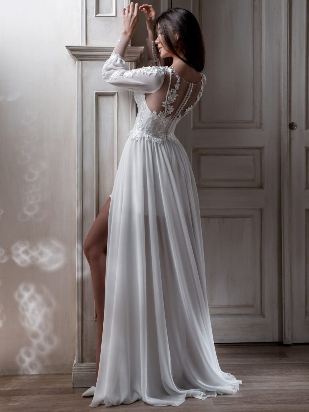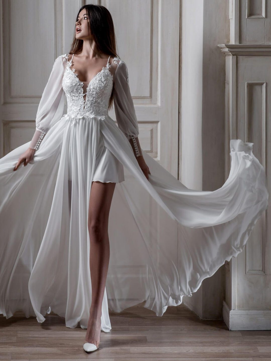 Νυφικό μεταξωτό σε αέρινη γραμμή με σκίσιμο μπροστά και κοντή επένδυση από μέσα, κεντημένο μπούστο με διαφάνεια τούλι σε σχήμα καρδιάς, φαρδύ μανίκι κεντημένο, πλάτη από τούλι κεντημένη με δαντέλα και λεπτομέρειες επάνω. Ένα elegant νυφικό που θα κλέψει την παράσταση. Πολλές νύφες μας, μας έχουν εμπιστευτεί και έχουν αγοράσει με τις συμβουλές μας το νυφικό τους online. Αν δεν είσαι σίγουρη για την εφαρμογή του μπορείς να κλείσεις ραντεβού για πρόβα στο info@missvanity.gr για να επισκεφτείς το φυσικό μας κατάστημα και κέρδισε 10% έκπτωση. Για οποιαδήποτε πληροφορία ή ραντεβού κάλεστε στο 22210 86623.