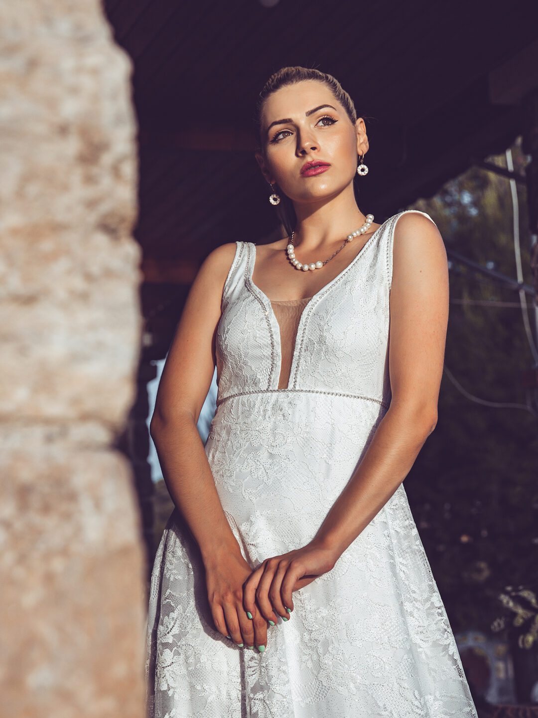 Ρομαντικό nυφικό με κεντημένη δαντέλα και ανοιχτή πλάτη. Μπούστο V με soleil διαφάνεια, τιράντες και V πλάτη ανοιχτή μέχρι τη μέση, σε άλφα γραμμή. Διακοσμημένο με στρας στη μέση, στο μπούστο και τους ώμους. Κανονική εφαρμογή.