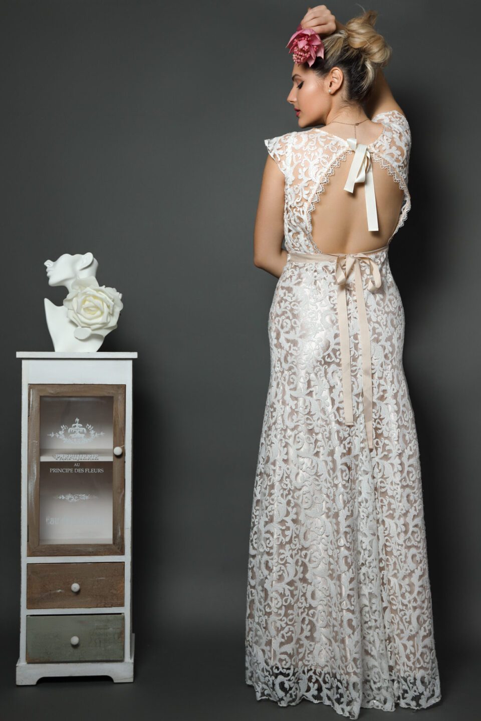 Νυφικό φόρεμα με ανάγλυφη δαντέλα και nude σατέν εσωτερικά. Σε άλφα γραμμή, με υπέροχη πλάτη και τιράντες δαντέλας. Κανονική εφαρμογή