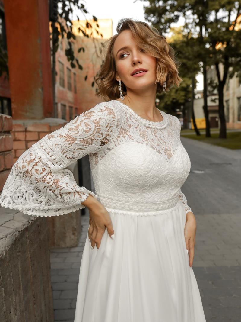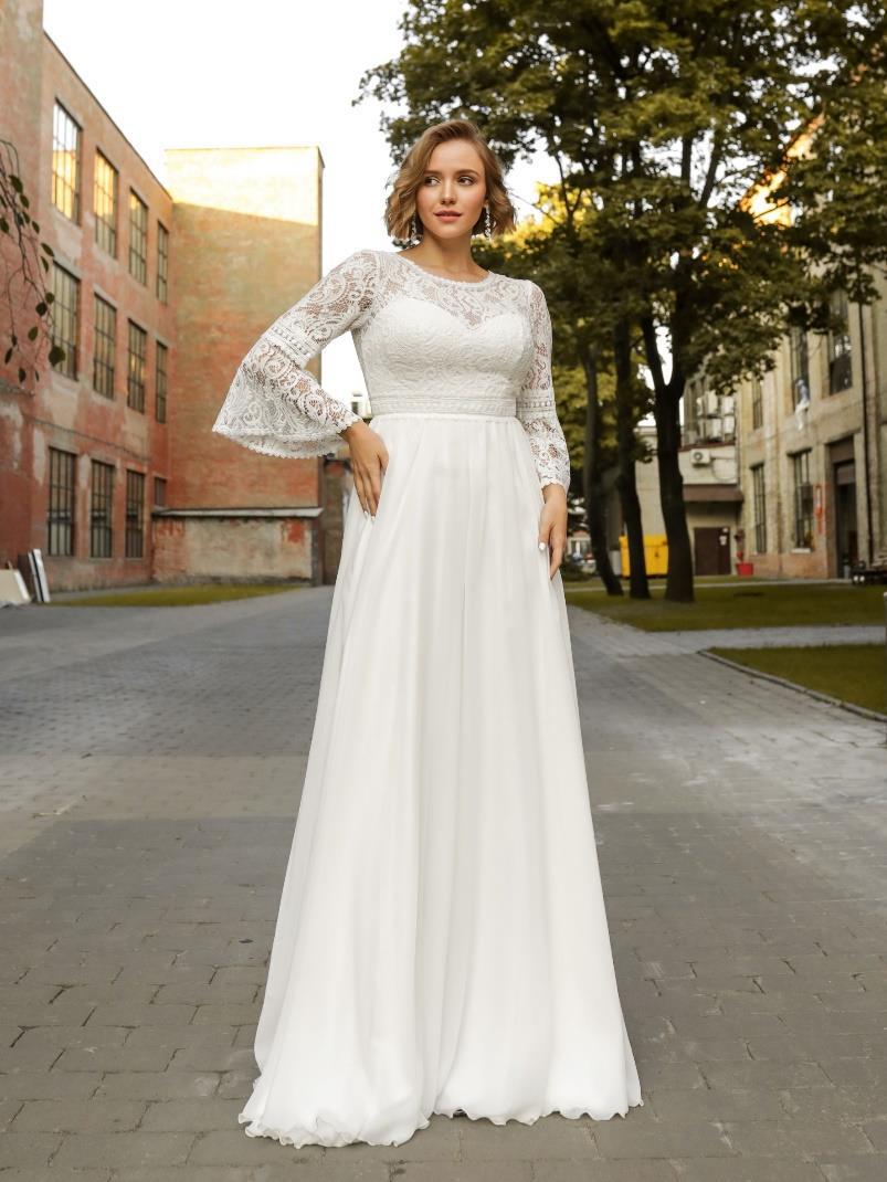 Νυφικό φόρεμα με μπούστο και μανίκι όλο δαντέλα με άνοιγμα καμπάνα. Αέρινη φούστα σε μεταξωτή μουσελίνα και Άλφα γραμμή, με ψιλόμεσο ζωνάκι. Ιδανικό για πολιτικό γάμο και θρησκευτικό αλλά και για εγκυμοσύνη. Κανονική εφαρμογή