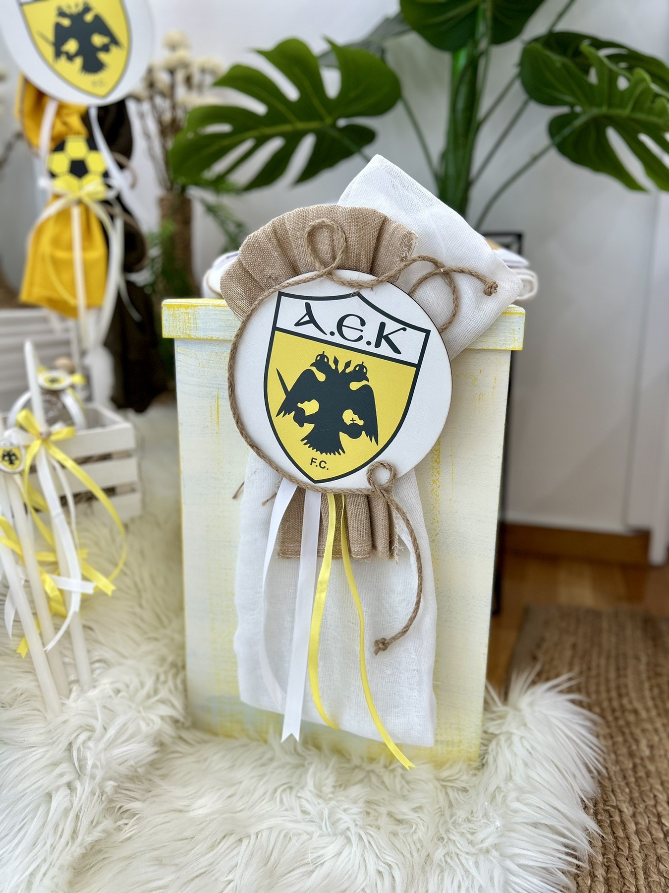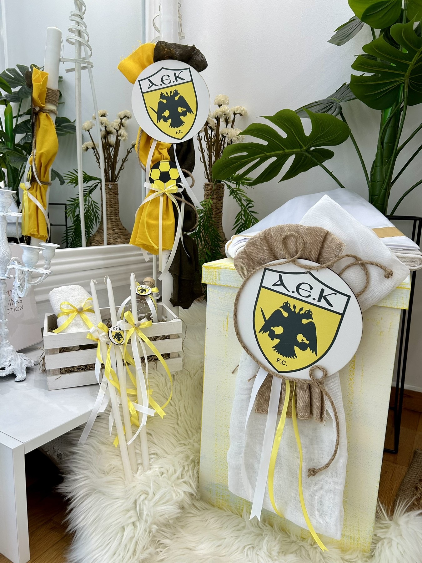 Ολοκληρωμένο πακέτο βάπτισης με θέμα ΑΕΚ. Το πακέτο περιλαμβάνει ξύλινο μπαούλο, λαδόπανα, 3 κεράκια κολυμπήθρας, σαπουνάκι, μπουκαλάκι λαδιού και 50 μαρτυρικά.