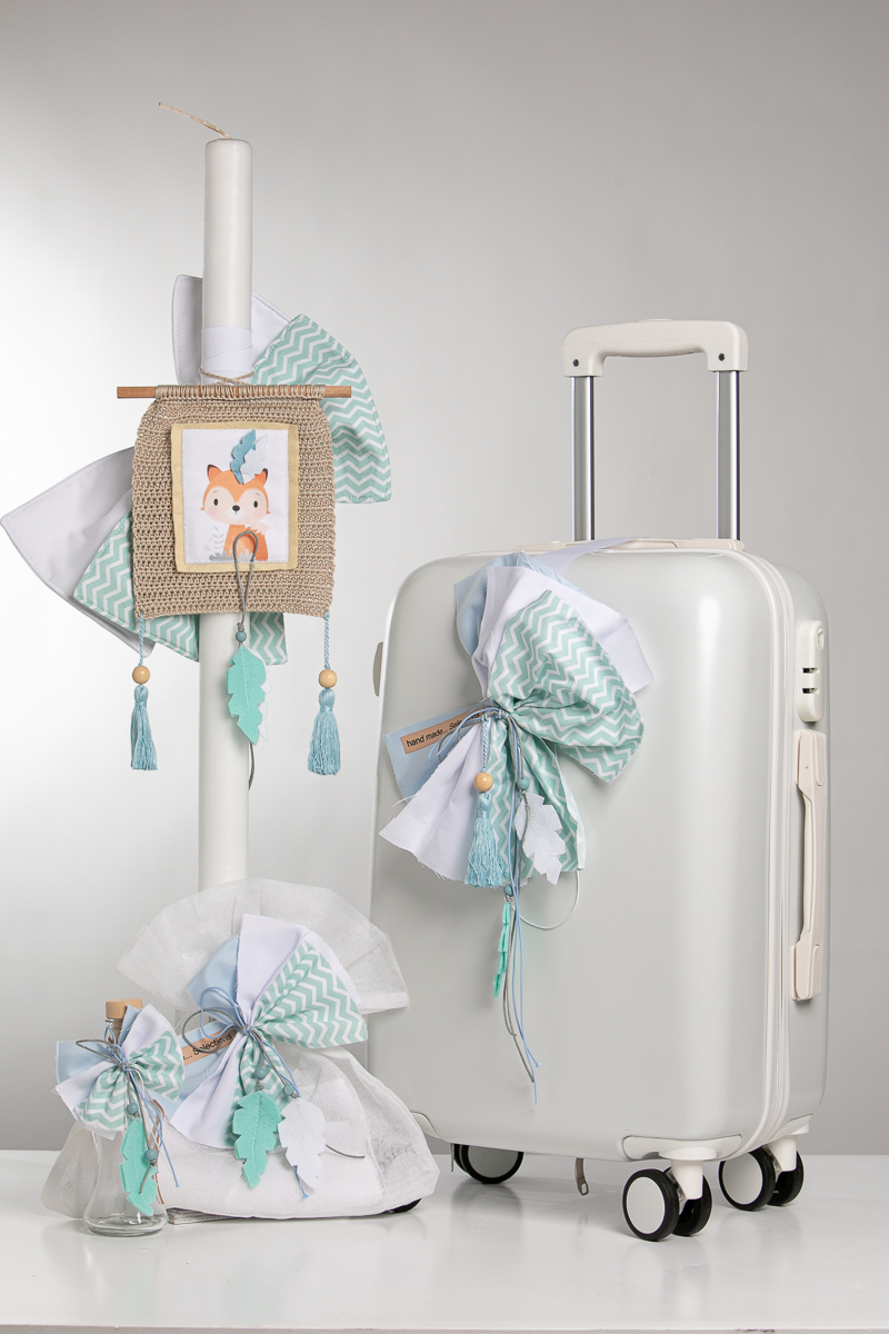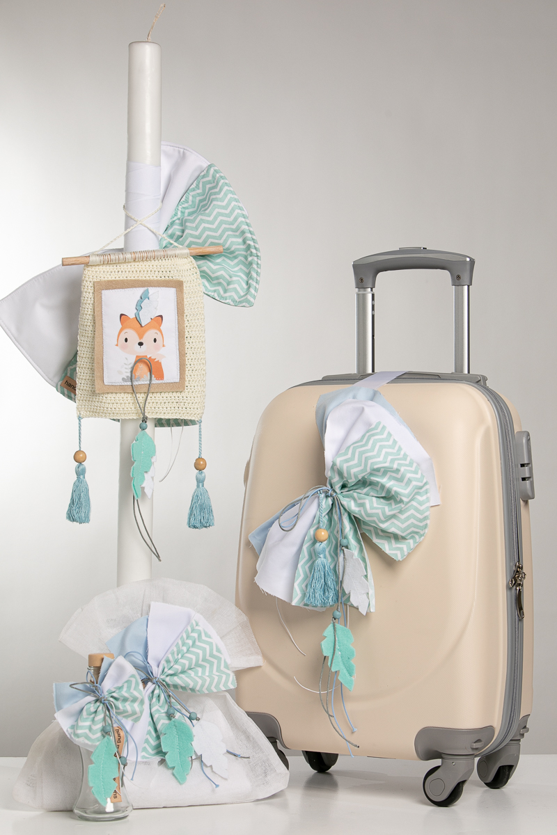 Ολοκληρωμένο πακέτο βάπτισης με θέμα αλεπουδάκι.Το πακέτο περιλαμβάνει τροχήλατη βαλίτσα, λαδόπανα, 3 κεράκια κολυμπήθρας, σαπουνάκι, μπουκαλάκι λαδιού και 50 μαρτυρικά.
