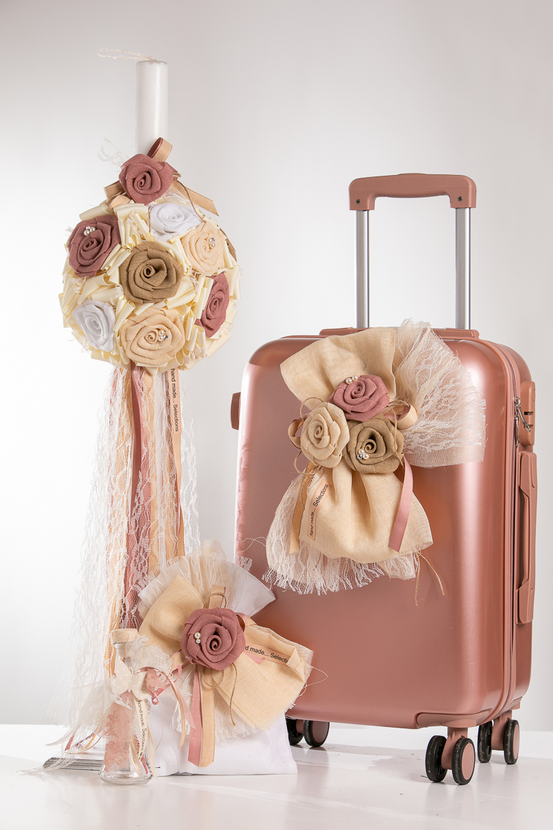 Ολοκληρωμένο πακέτο βάπτισης με θέμα ανθοδέσμη. Το πακέτο περιλαμβάνει τροχήλατη βαλίτσα, λαδόπανα, 3 κεράκια κολυμπήθρας, σαπουνάκι, μπουκαλάκι λαδιού και 50 μαρτυρικά
