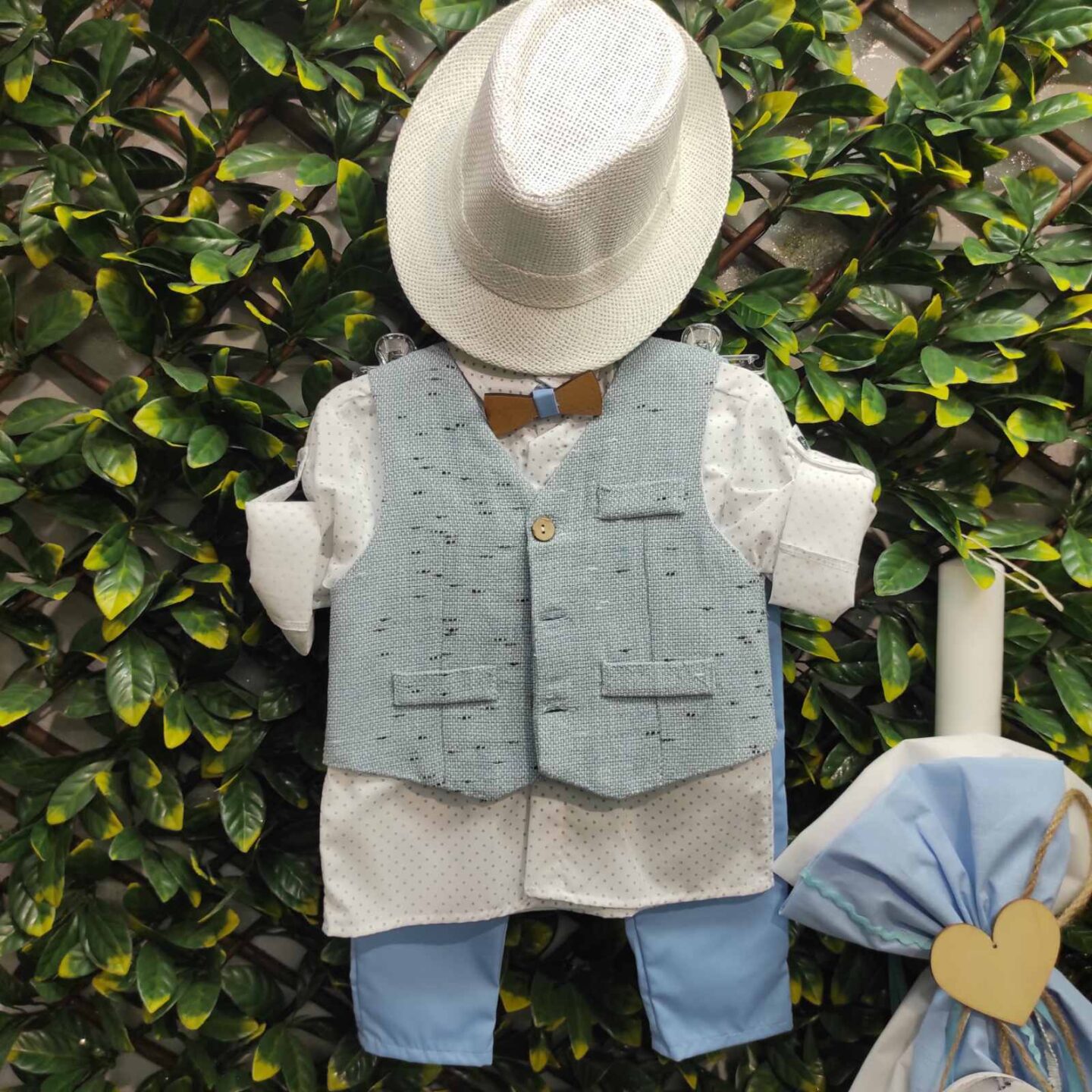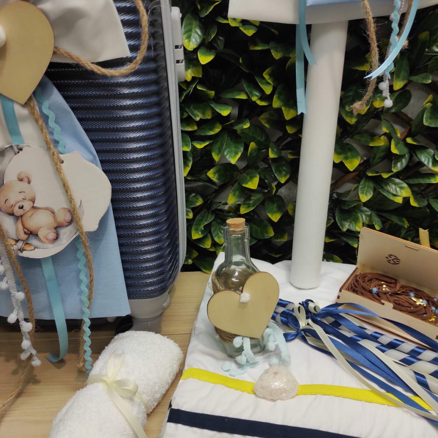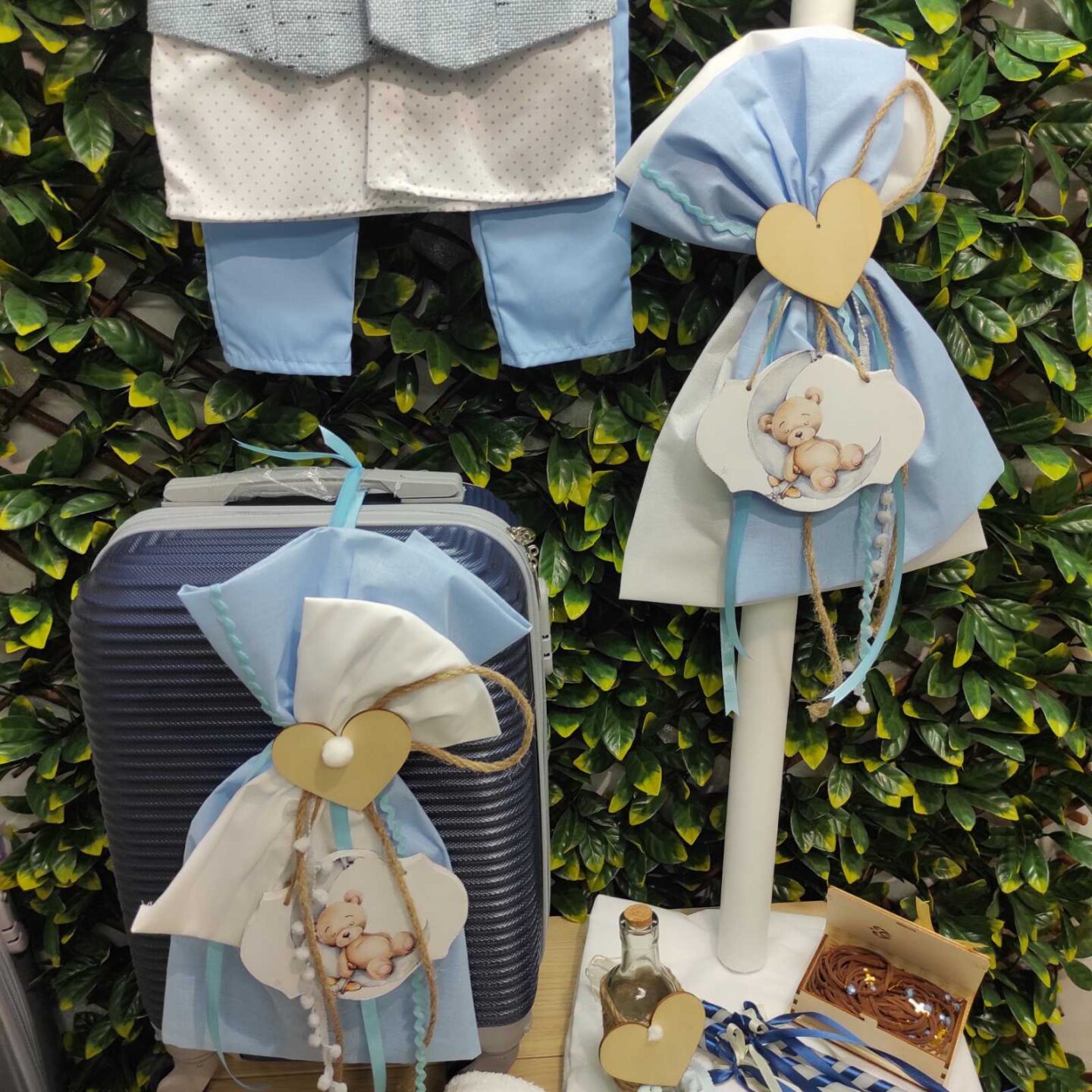 Ολοκληρωμένο πακέτο βάπτισης με θέμα αρκουδάκι. Το πακέτο περιλαμβάνει τροχήλατη βαλίτσα, λαδόπανα, 3 κεράκια κολυμπήθρας, σαπουνάκι, μπουκαλάκι λαδιού, 50 μαρτυρικά και καλτσούλες.
